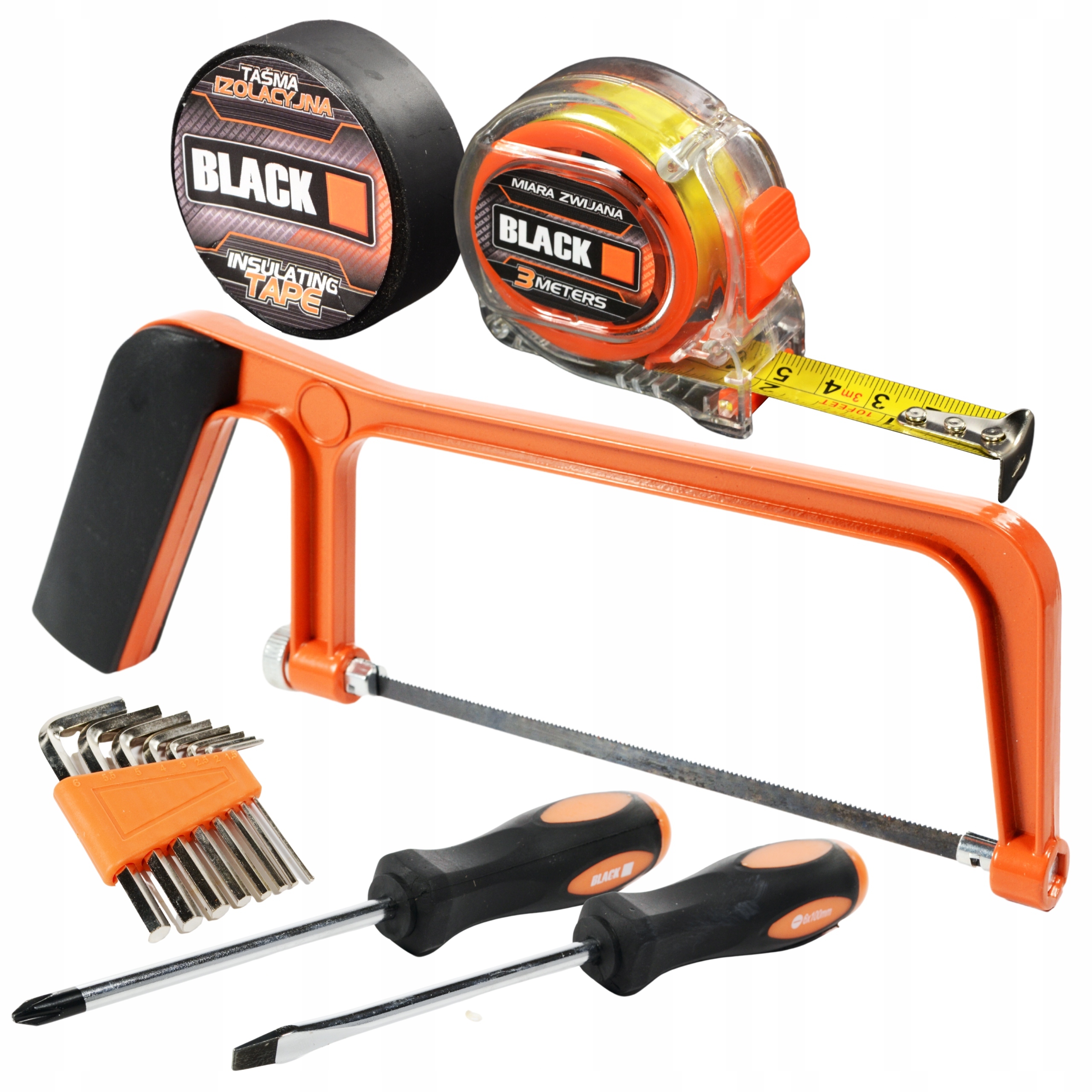 В комплект входят молоток 350гр, плоскогубцы 6", плоскогубцы 6", пила с пильным полотном, тестер напряжения, разводной ключ 8", рулетка 3 м, гидравлические клещи 8", нож для обоев, лезвия ножей (5 шт.), набор шестигранных ключей (1,5; 2; 2,5; 3; 4; 5; 5,5; 6). мм), набор отверток (SL6х100мм, PH2x100мм), набор отверток PH (0-1, SL 1,4-2,0-2,4-3,0мм), набор бит в держателе (10 шт.), набор торцевых ключей (1/4 головки 5,6,7,8,9,10,11,12,13мм), трещотка 1/4, изоляционная лента и набор соединительных элементов (штифты, винты и т.п.).