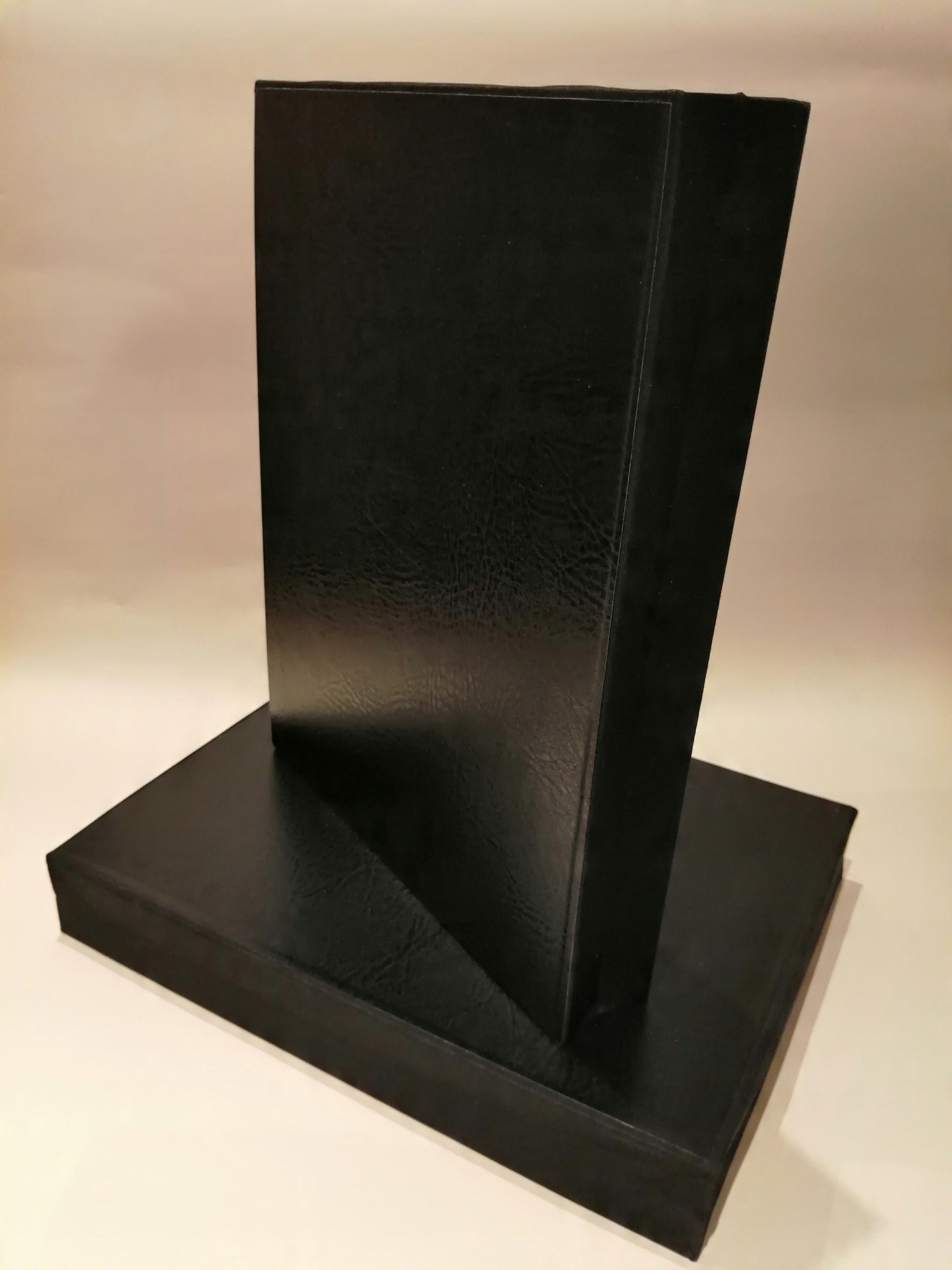 Конструкция - плотный картон с наклеенной итальянской переплётной тканью. Боковины покрыты шпоном ПРЕМИУМ с текстурой кожи.