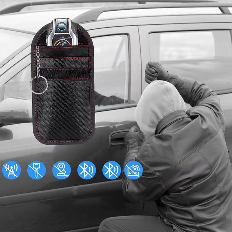 Чехол: выполнен из карбоновой кожи + наноэкранирующий материал, внутренняя часть - из высококачественной защитной ткани. Очень прочный и элегантный. Размеры подобраны таким образом, чтобы поместился любой ключ от машины. Кроме того, вы можете хранить в футляре свое удостоверение личности, водительские права и платежные карты, чтобы защитить их от кражи данных.