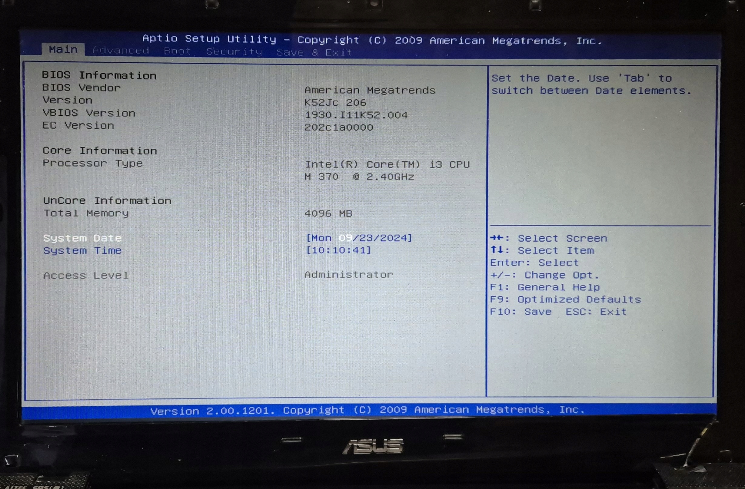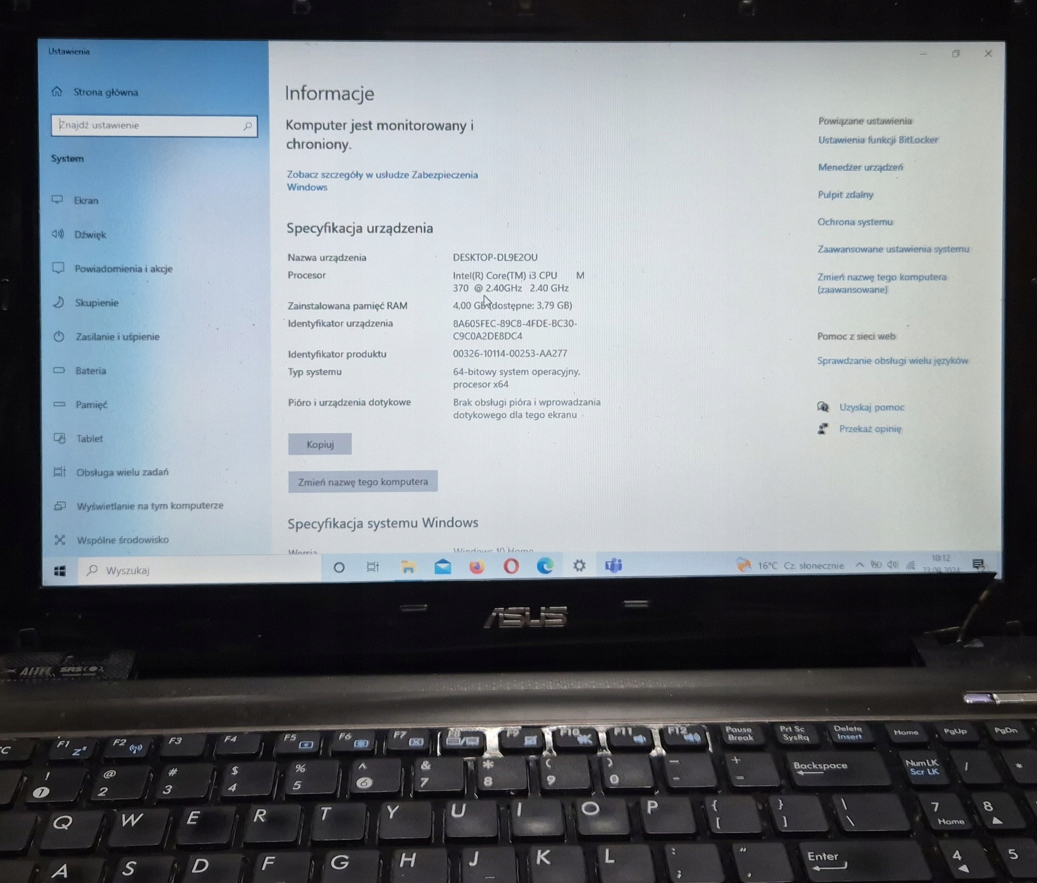 Параметры ноутбука: