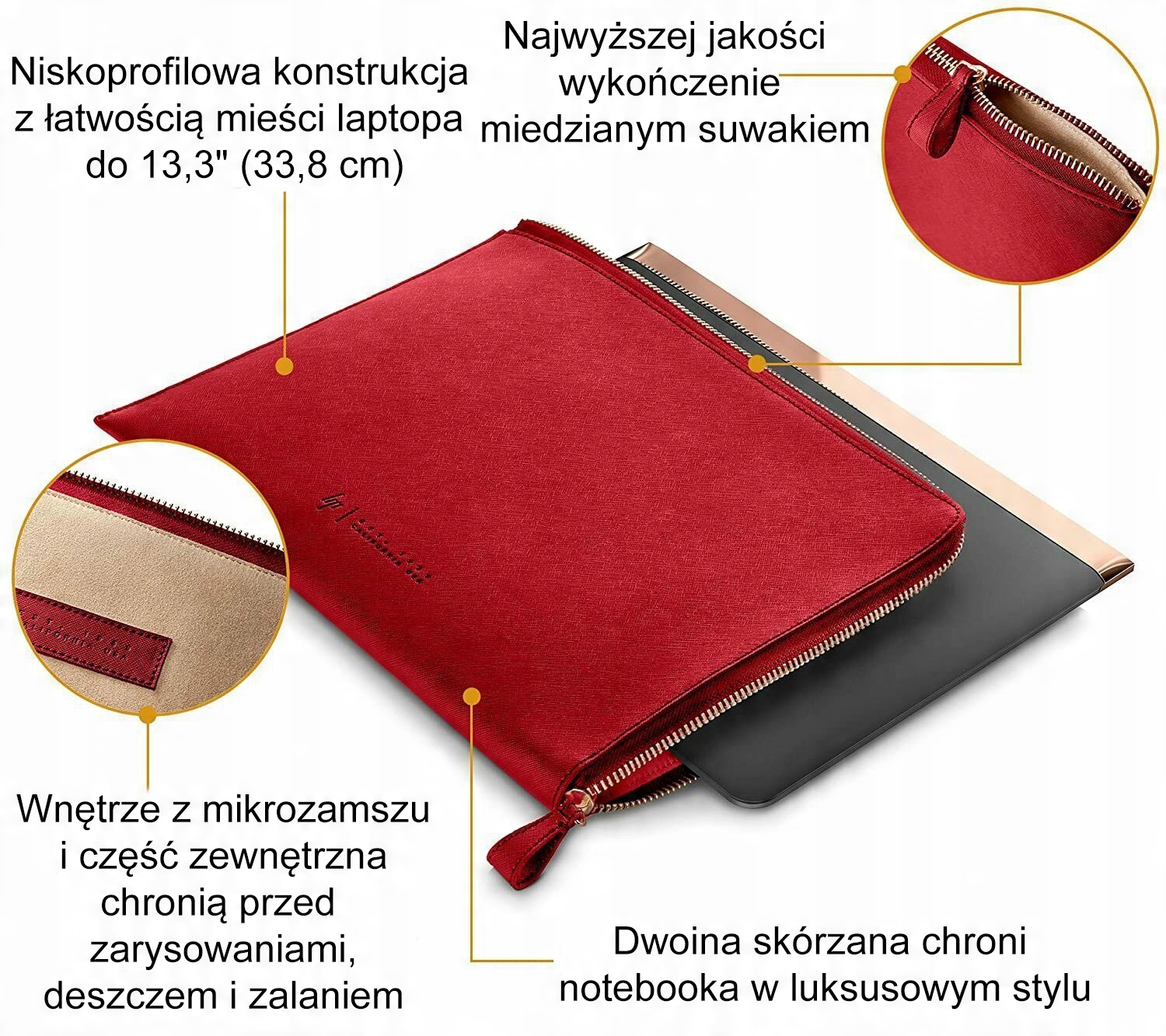 Элегантный материал из спилка обеспечивает защиту вашего ноутбука и подчеркивает ваш стиль. Внешняя часть чехла изготовлена из 90% спилка и 10% полиуретана. Элегантная медная отделка придает практичной застежке изысканный и современный характер.