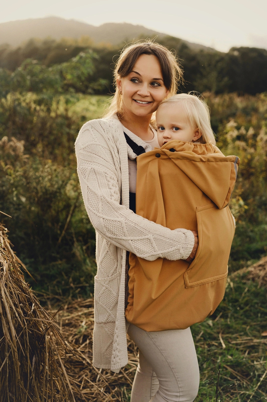 Чехол Softshell оснащен инновационной и простой системой регулировки. Просто прикрепите его к обеим лямкам переноски или накидки, укройте ребенка, а затем отрегулируйте ширину и высоту с помощью резинок со стопорами.