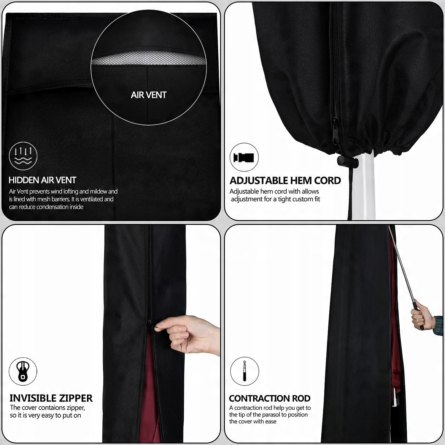 - 【Специальная вентиляция 】 – Хорошо сделанное вентиляционное отверстие в верхнем положении не только придает чехлу зонта стильный вид, но также предотвращает образование конденсата и вздутие живота на ветру, поскольку оно способствует хорошей циркуляции воздуха.