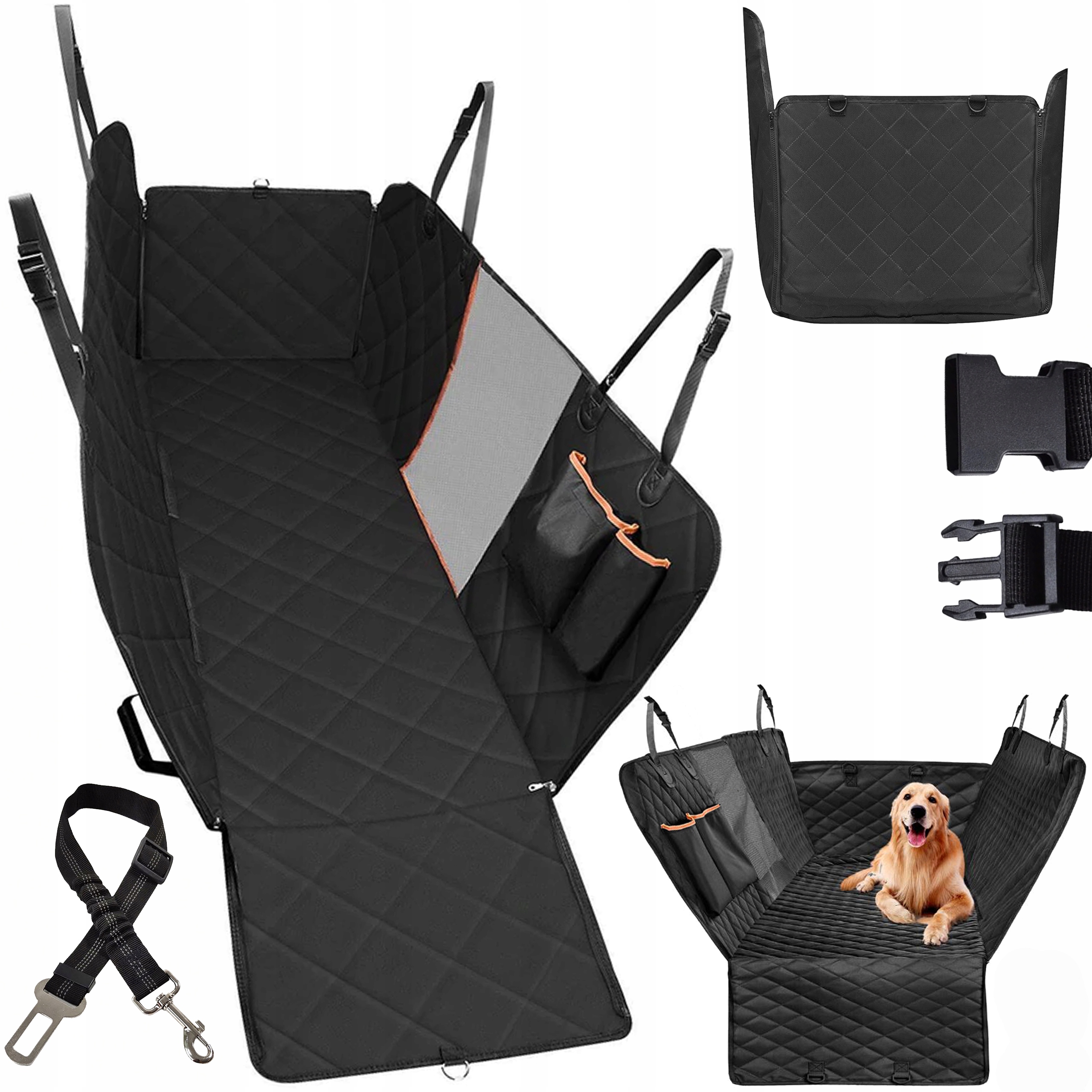 Собрать коврик для собаки очень просто. Специальные ручки с зажимами и карабинами значительно облегчают работу. Вы можете отрегулировать их длину так, чтобы они устойчиво располагались на подголовниках и боковых ручках автомобиля. Складные бортики коврика также являются функциональным решением. Они застегиваются на молнии, поэтому после открытия дверцы их можно быстро развернуть, чтобы животное могло безопасно и спокойно выйти из автомобиля. Они обеспечивают дополнительную защиту чистоты автомобиля, так как закрывают всю сторону сидений, когда собака садится в машину.