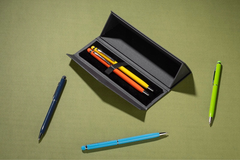 Стильный корпус канцелярских товаров в уникальной треугольной форме с магнитной застежкой. Интерьер облицован мягкой велюрной подушкой, которая обеспечивает тонкую защиту вашей любимой письменной посуды. Кроме того, оснащен практической лентой для ручек, что позволяет легко и быстрое удаление канцелярских товаров. Дело будет разместить одну или до двух ручек, перьев или карандашей. Описанный из экологической бумаги, это отличная альтернатива традиционным синтетическим материалам. Идеально идеально подходит как для личного использования, так и для элегантного подарка.