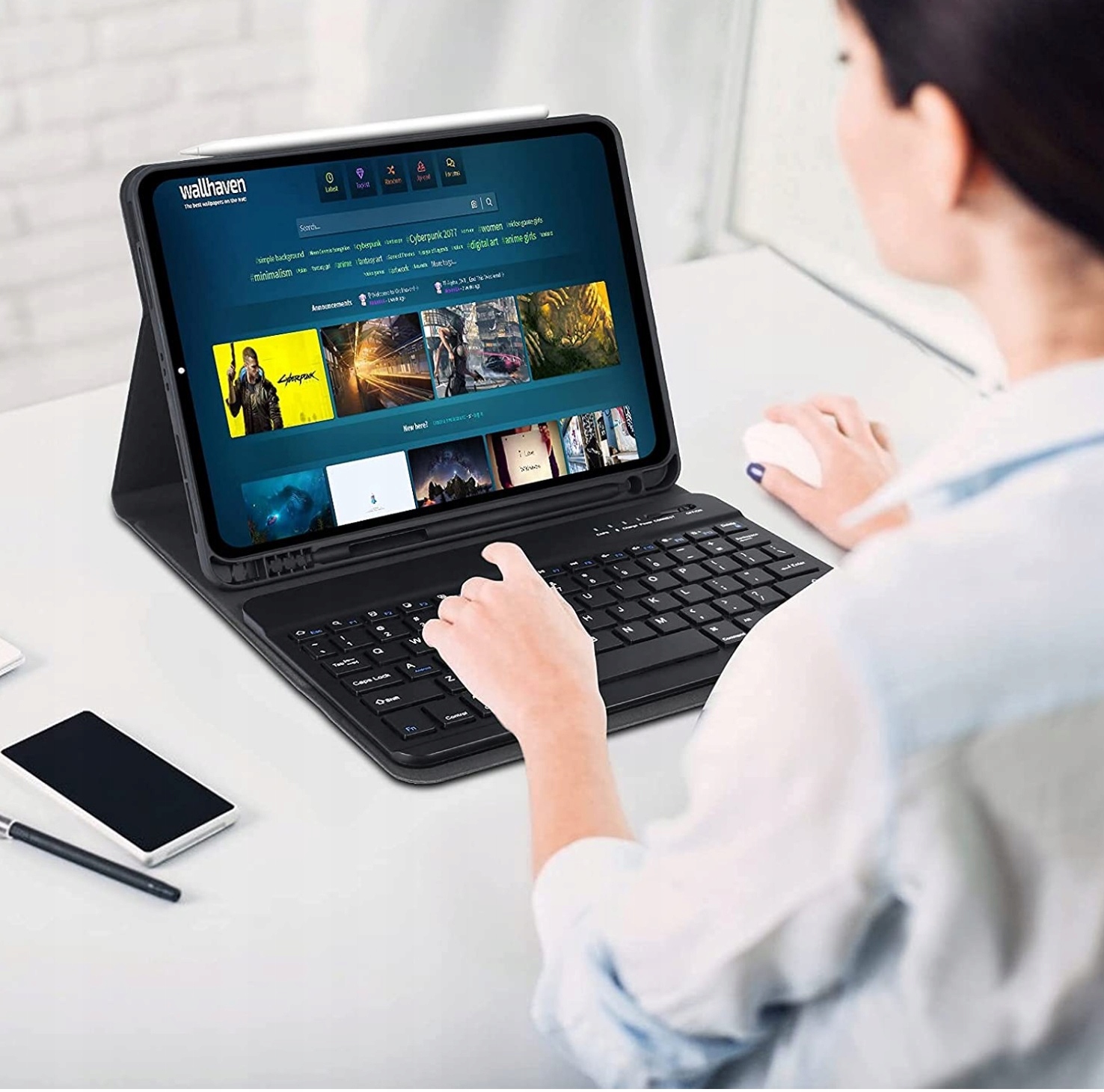 Чехол выполнен из очень прочной эко-кожи. Планшет и защита выглядят эстетично благодаря минимальной толщине корпуса. Наш планшет защищен на 100%. Вам не придется беспокоиться о царапинах или механических повреждениях. Кроме того, все слоты и кнопки открыты. Bluetooth-клавиатура очень высокого качества. Беспроводное соединение происходит мгновенно.