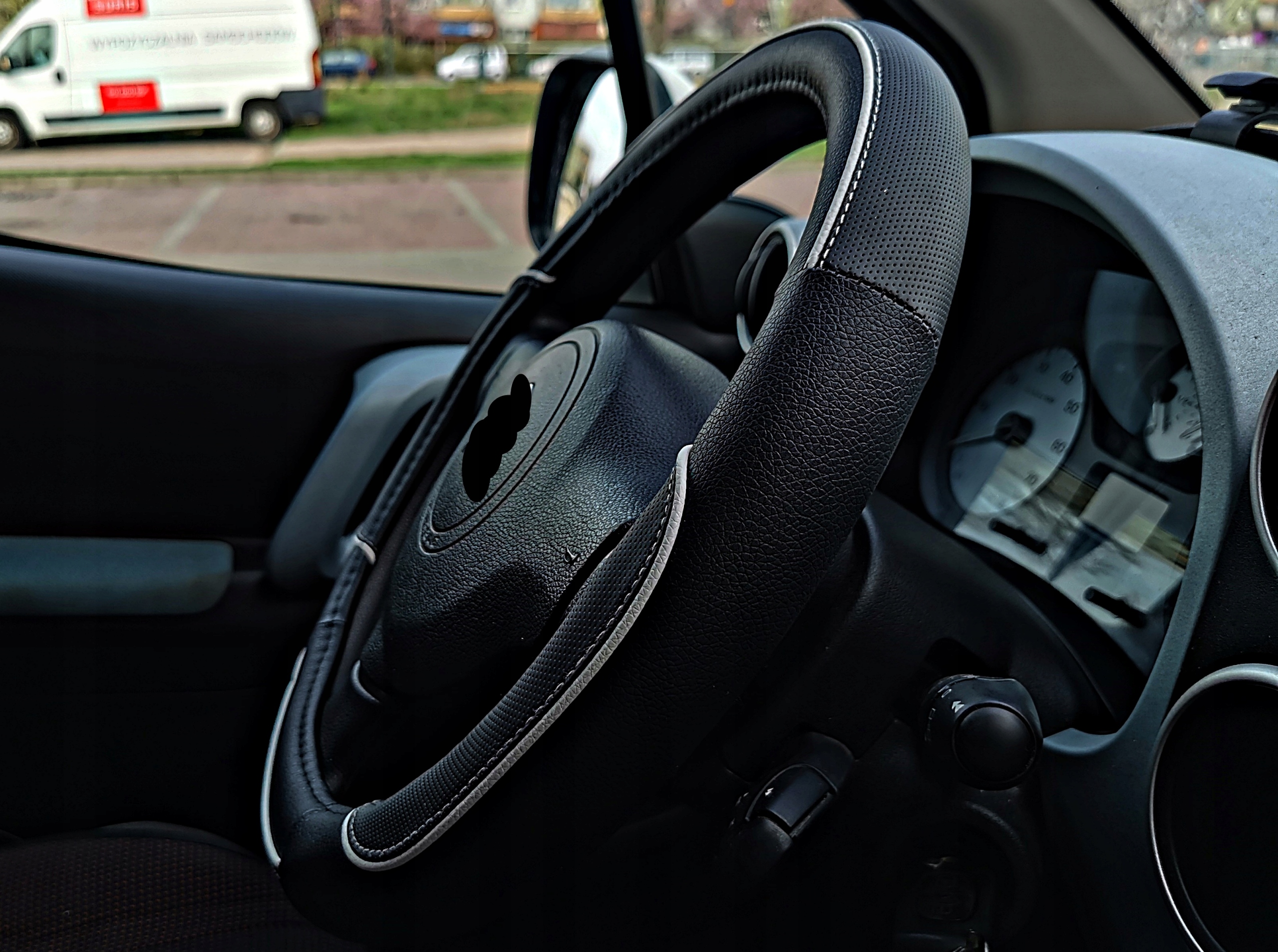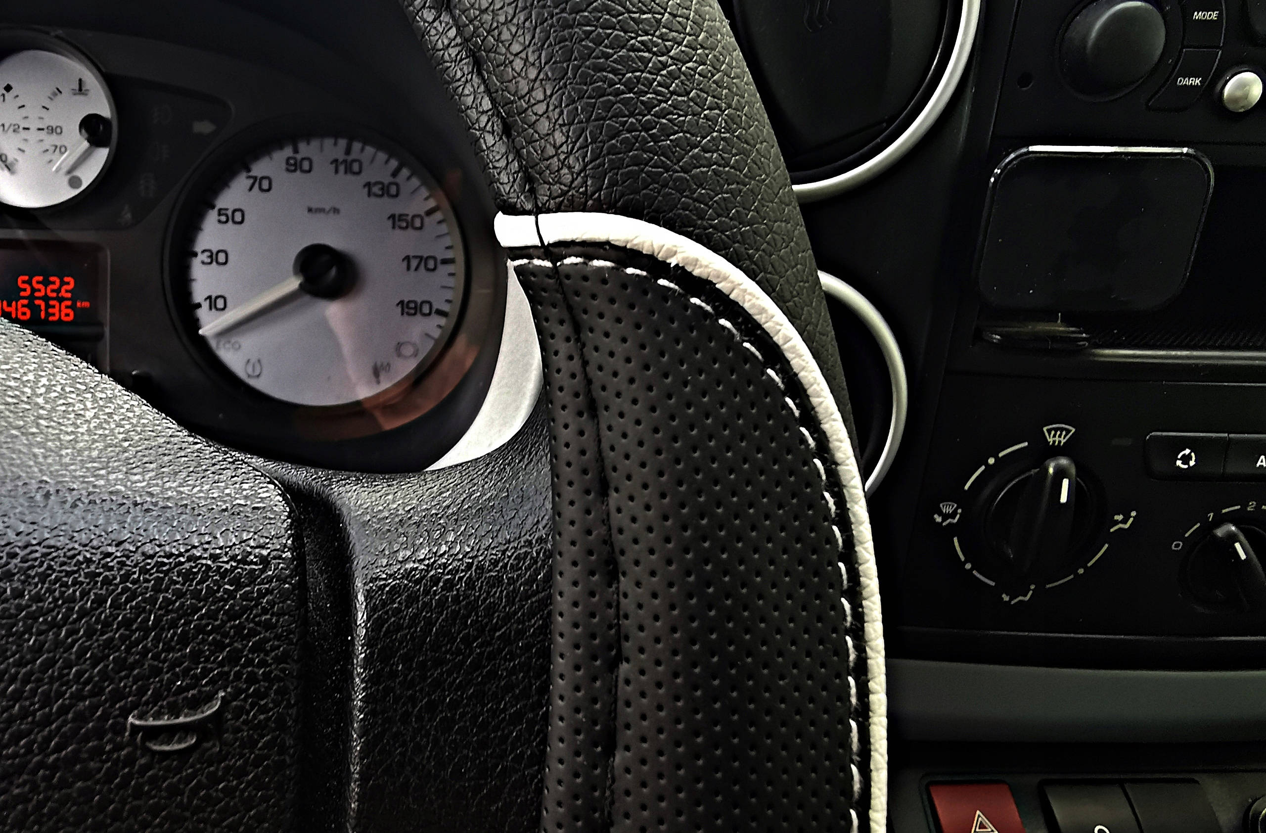 Чёрный чехол на руль с белым кантом, выполнен из качественной перфорированной и гладкой эко-кожи.