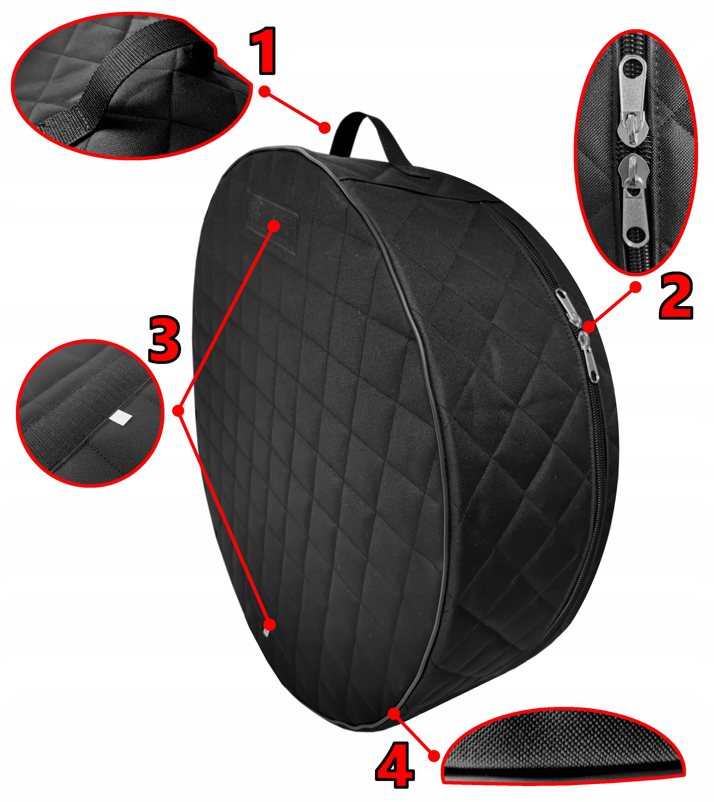 - Две застежки-липучки, вшитые в нижнюю часть чехла, предотвращающие скольжение чехла и колеса по багажнику.