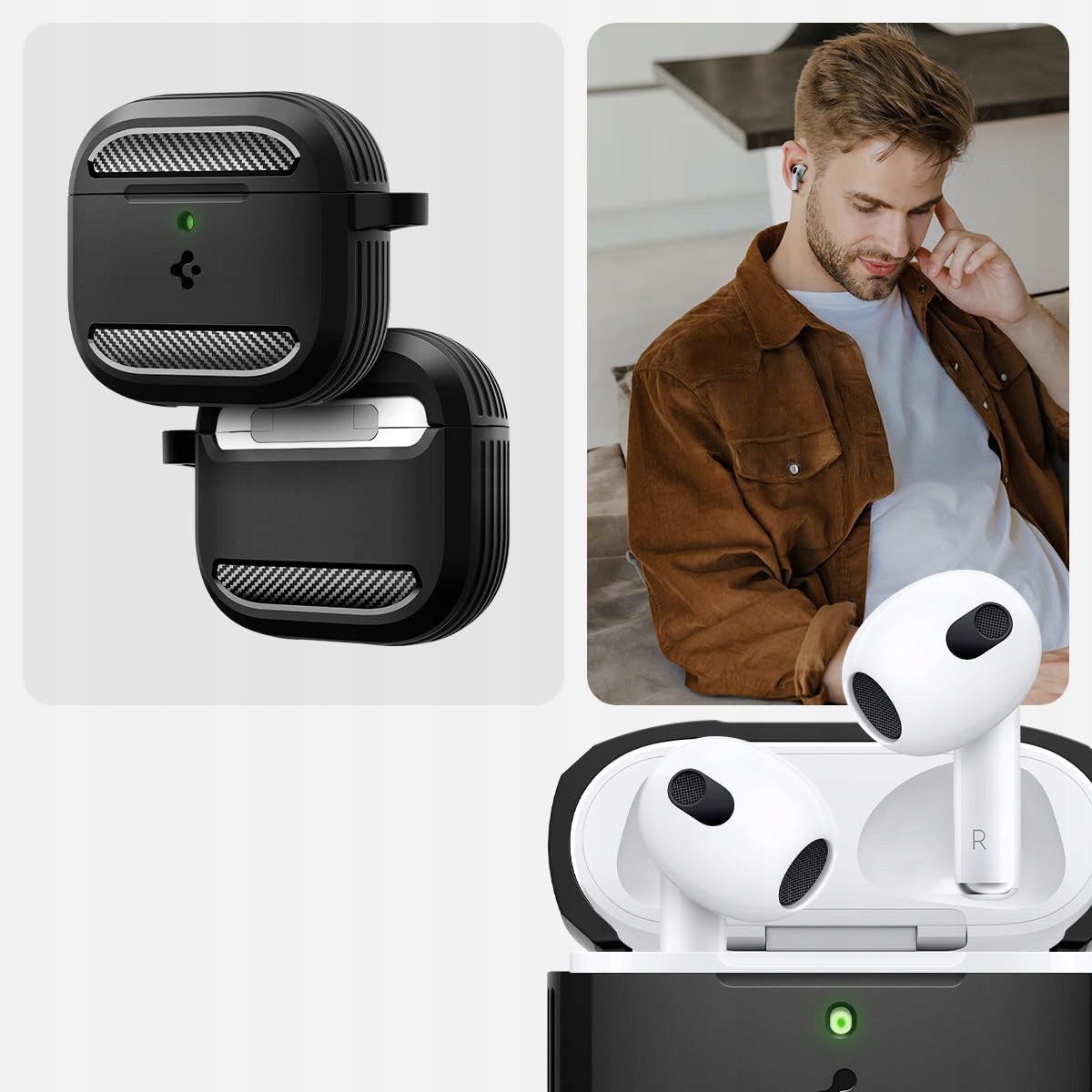 Чехол от бренда Spigen из серии Rugged Armor. Корпус изготовлен из мягкого и прочного термопластика, обеспечивающего защиту от царапин и повреждений. Матово-черная отделка в сочетании с вставками из углеродного волокна придает ему уникальный и современный вид. Это чехол, который выделяется среди других, подчеркивая при этом элегантность ваших наушников.