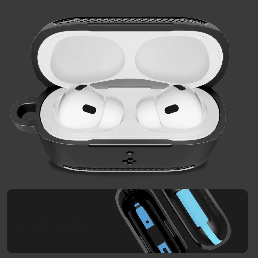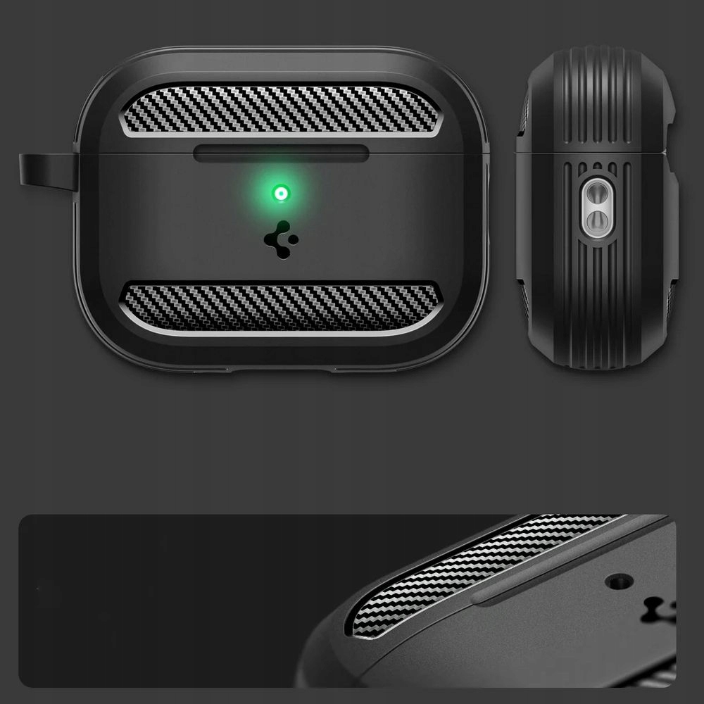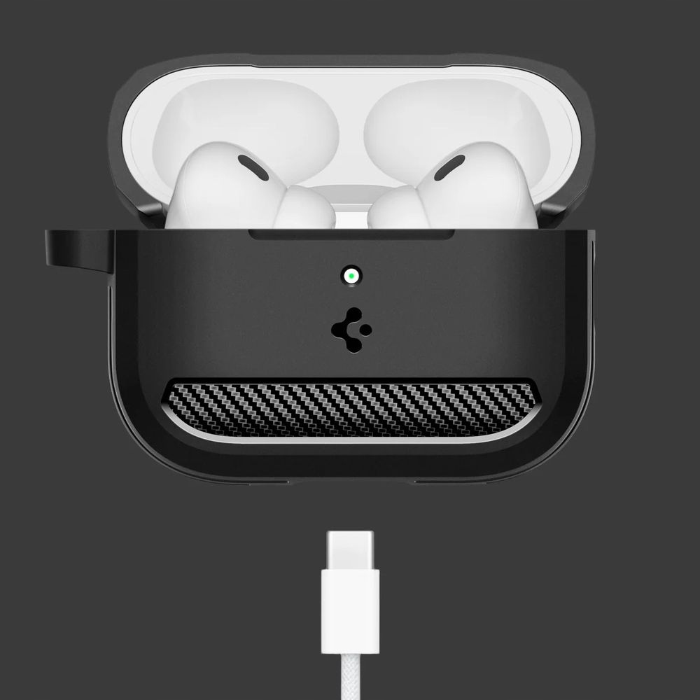 Чехол SPIGEN, предназначенный для AirPods Pro 3, идеально подходит. Изготовлен из амортизирующего гибкого ТПУ и отделан текстурой из углеродного волокна, придающей характер.