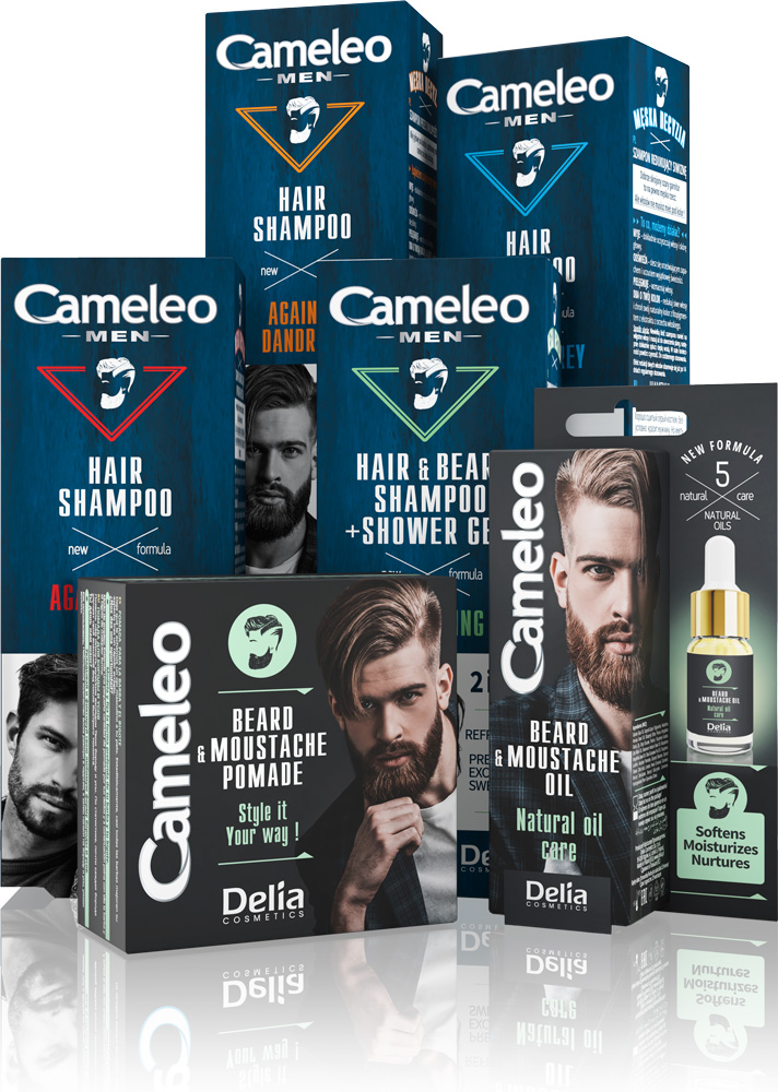 Предложение адресовано мужчинам входят и краски для волос, и обезжириватели, и даже специализированные препараты для бороды и усов. В обширный ассортимент продукции Cameleo также входят шампуни, предназначенные для удовлетворения различных мужских потребностей и проблем.