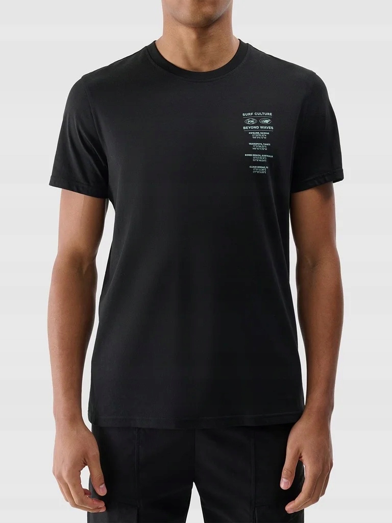 Футболка 4F изготовлена из 100% хлопка, что делает ее мягкой, прочной и приятной на ощупь. Круглый вырез горловины обработан легкими рубчиками. Спереди видна надпись «Surf Culture FOB 4F Beyond Waves» и принт с координатами мест для серфинга.