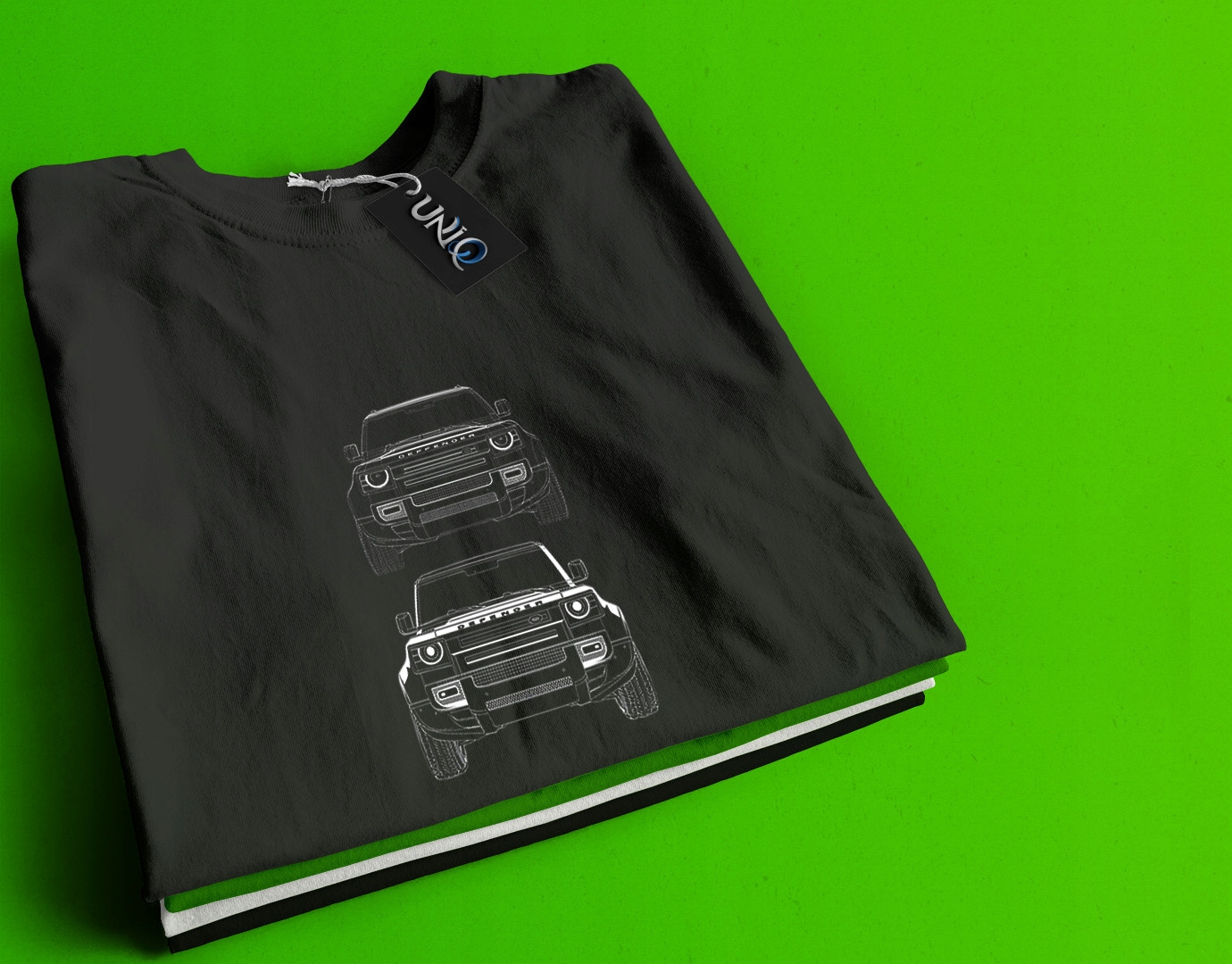 Хотите выразить свою страсть к культовому Land Rover Defender? Наша черная футболка с современным минималистичным принтом, изображающим переднюю часть Defender, — идеальный выбор!