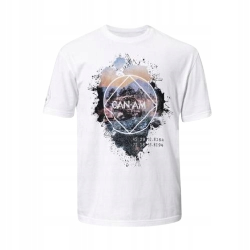 Original Men's Con-aM. Белая футболка с впечатляющим принтом с изображением горного пейзажа, геометрических линий и надписей с логотипом Can-AM. Это отличается уникальным, открытым стилем, идеально подходящим для энтузиастов внедорожника и приключений по бездорожью