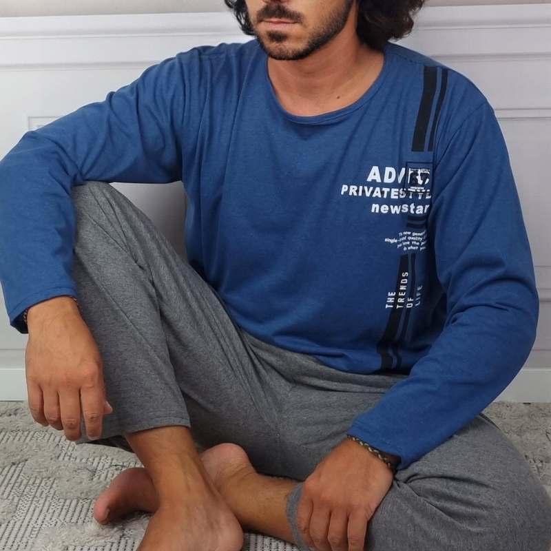 Мужская пижама-двойка - модель ADVICE представляет собой спальный комплект, состоящий из классической блузки с длинными рукавами и круглый вырез и длинные брюки. Вся вещь изготовлена из хлопка, приятного на ощупь и позволяющего коже дышать. В верхней части блузки небольшой принт. Недавящая шнуровка на талии делает брюки чрезвычайно удобными и универсальными. Спальный комплект также с успехом можно использовать как спортивный костюм или домашнюю одежду.