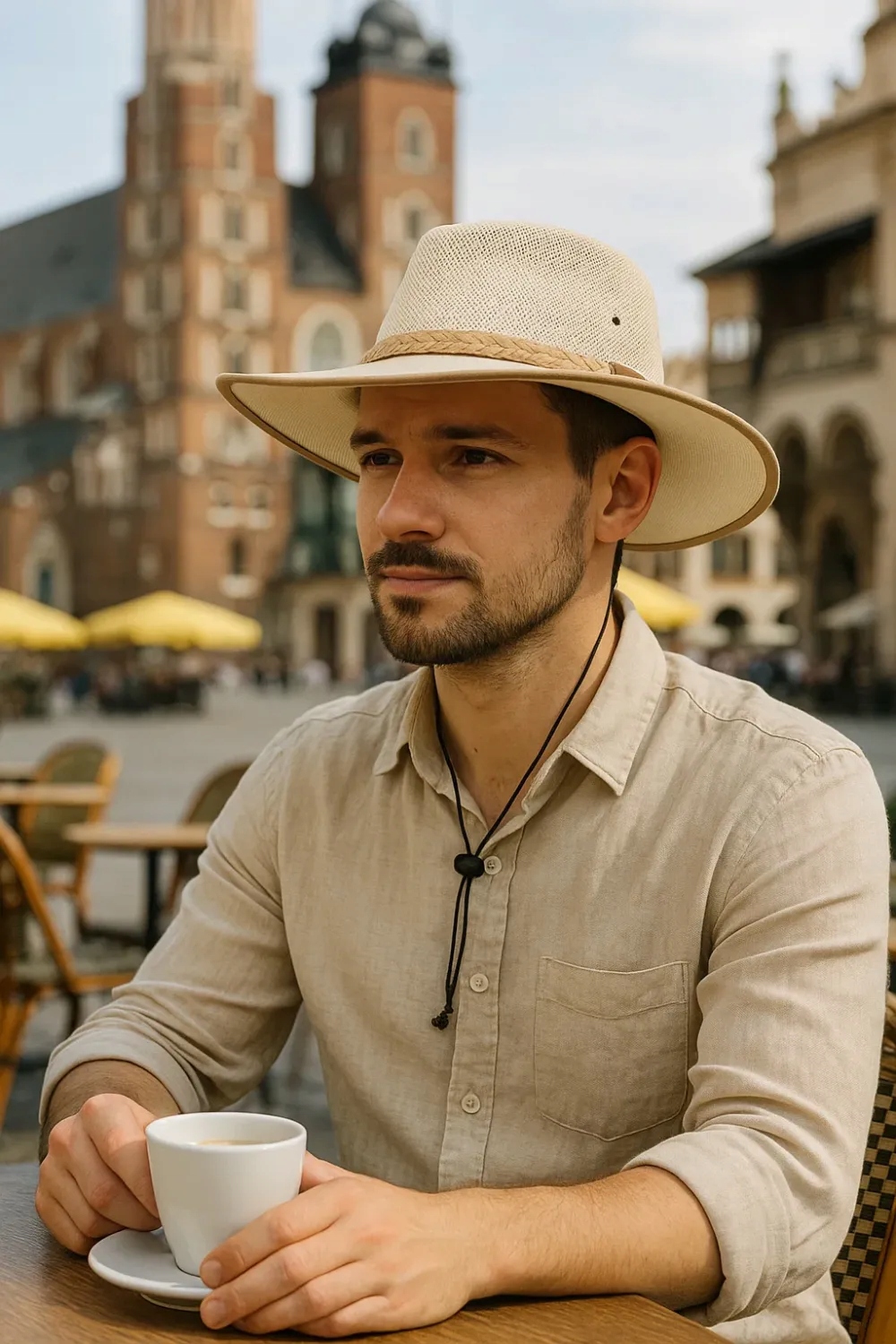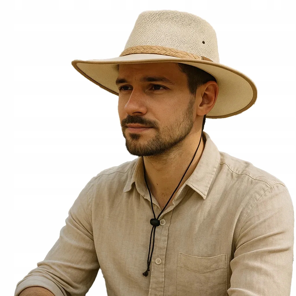 - это шляпа, которая говорит: «Я готов к приключению, но я не забываю об элегантности». Дыхающая сетка работает на жару, и веревка под подбородком говорит: «Ветер не боится меня». Он работает в поле, смотрит в город - что еще вам нужно?
