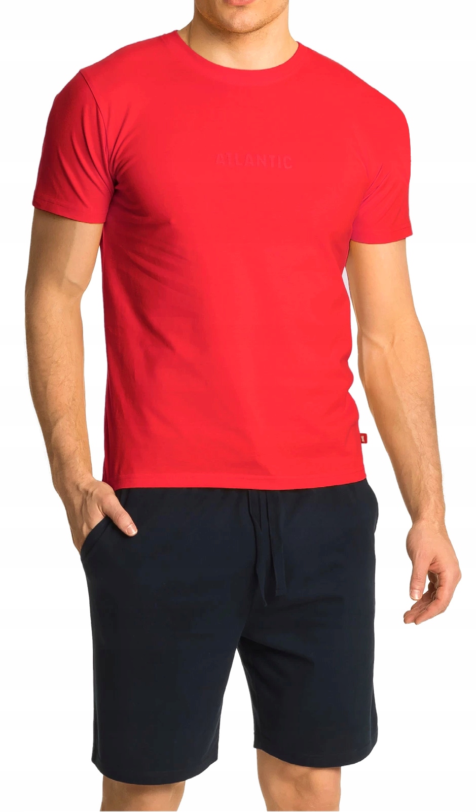 Красная футболка также однотонная и имеет надпись ATLANTIC посередине.