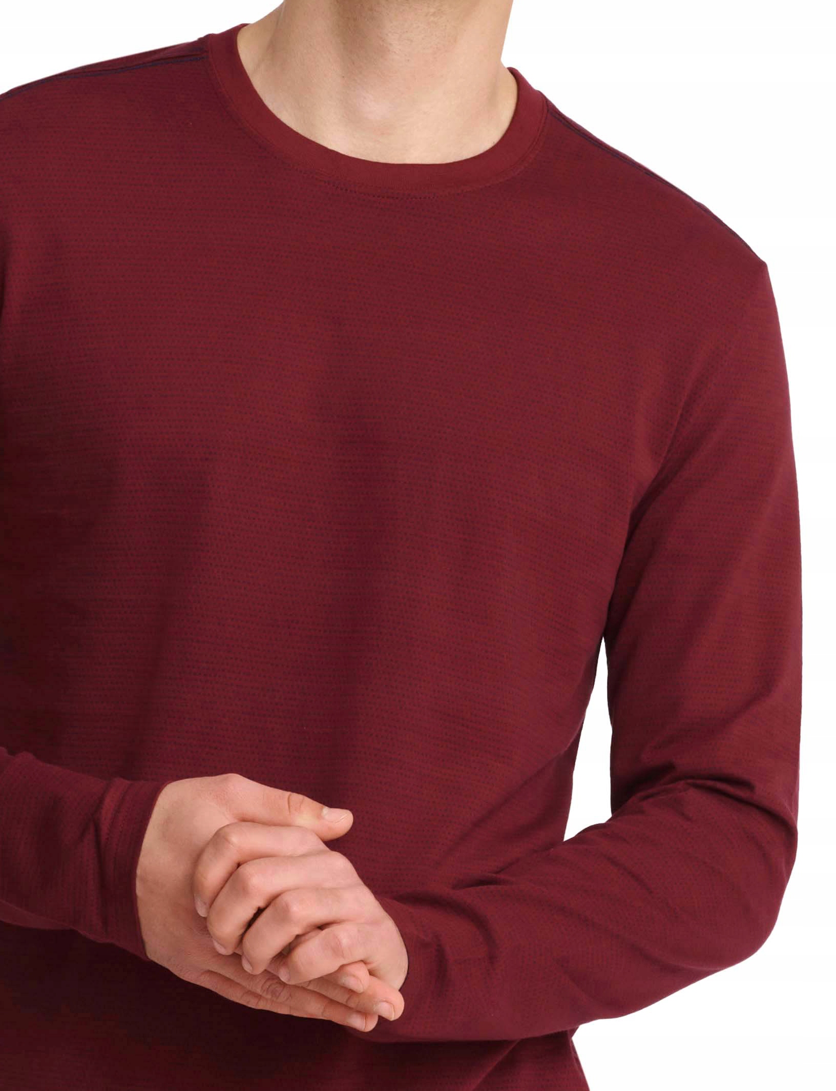 Футболка имеет классический круглый вырез и длинные рукава. Бордовая блузка была покрыта мелким узором.