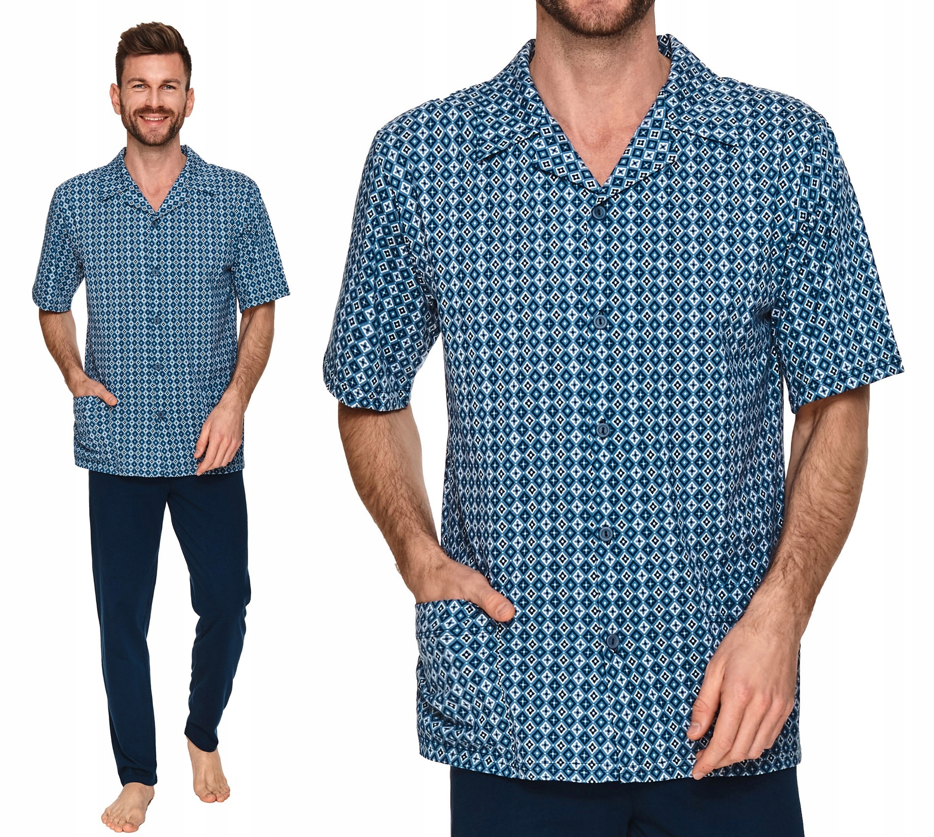 Потрясающая мужская пижама с короткими рукавами и длинными брюками. Модель адресована полным мужчинам, которые рассчитывают на максимальный комфорт. Хлопок высочайшего качества делает мужскую пижаму Taro EVGENI очень устойчивой к скатыванию. Удобная застежка на пуговицы делает его очень практичным, поэтому он идеально подходит для повседневного использования дома, а также в больнице или санатории. Разархивировав его, вы легко сможете подготовиться к обследованию или процедуре. По бокам есть два кармана, куда можно спрятать мелкие предметы, например, ключи, телефон и т. д. Польский производитель