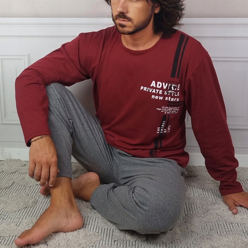 Мужская пижама-двойка - модель ADVICE представляет собой спальный комплект, состоящий из классической блузки с длинными рукавами и круглый вырез и длинные брюки. Вся вещь изготовлена из хлопка, приятного на ощупь и позволяющего коже дышать. В верхней части блузки небольшой принт. Недавящая шнуровка на талии делает брюки чрезвычайно удобными и универсальными. Спальный комплект также с успехом можно использовать как спортивный костюм или домашнюю одежду.