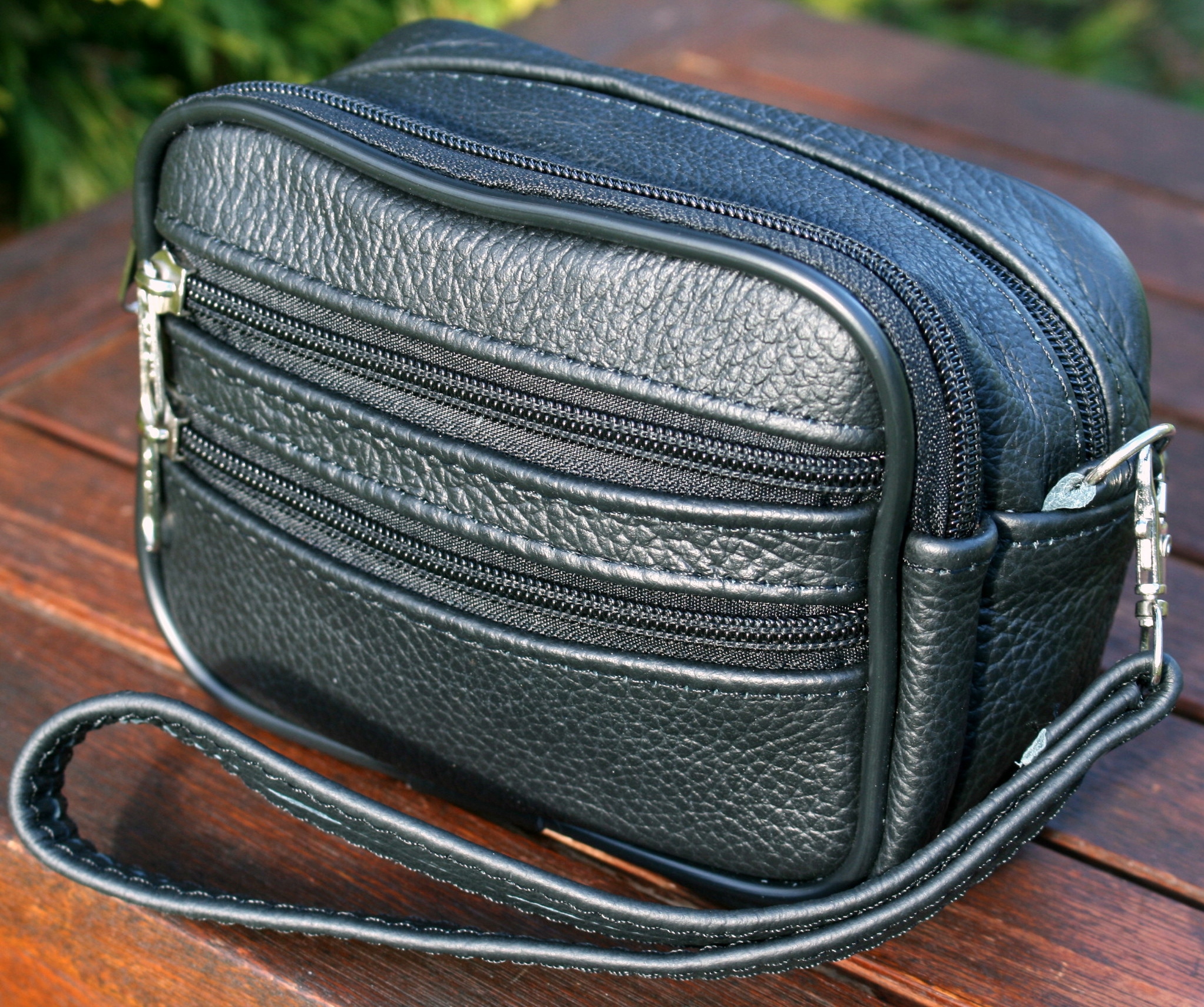 Мужская сумка полностью из натуральной лицевой кожи, с удобными петлями для ремня. Маленькая модель оснащена двумя отделениями и двумя дополнительными отделениями на молнии.