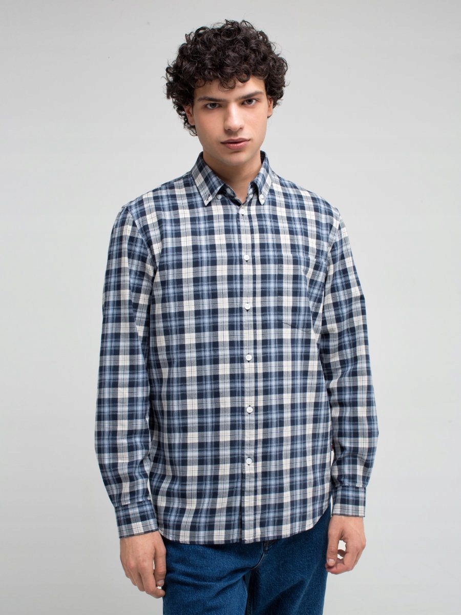 Мужская рубашка из линии Authentic. Изготовлен из очень приятного и приятного на ощупь хлопка темно-синего и синего цветов. Воротник застегивается на пуговицы. Карман спереди. Манжета с регулируемой окружностью. Внутренняя кокетка и манжеты выполнены из ткани контрастного синего цвета. На шее сзади металлическая пластина с логотипом Big Star.