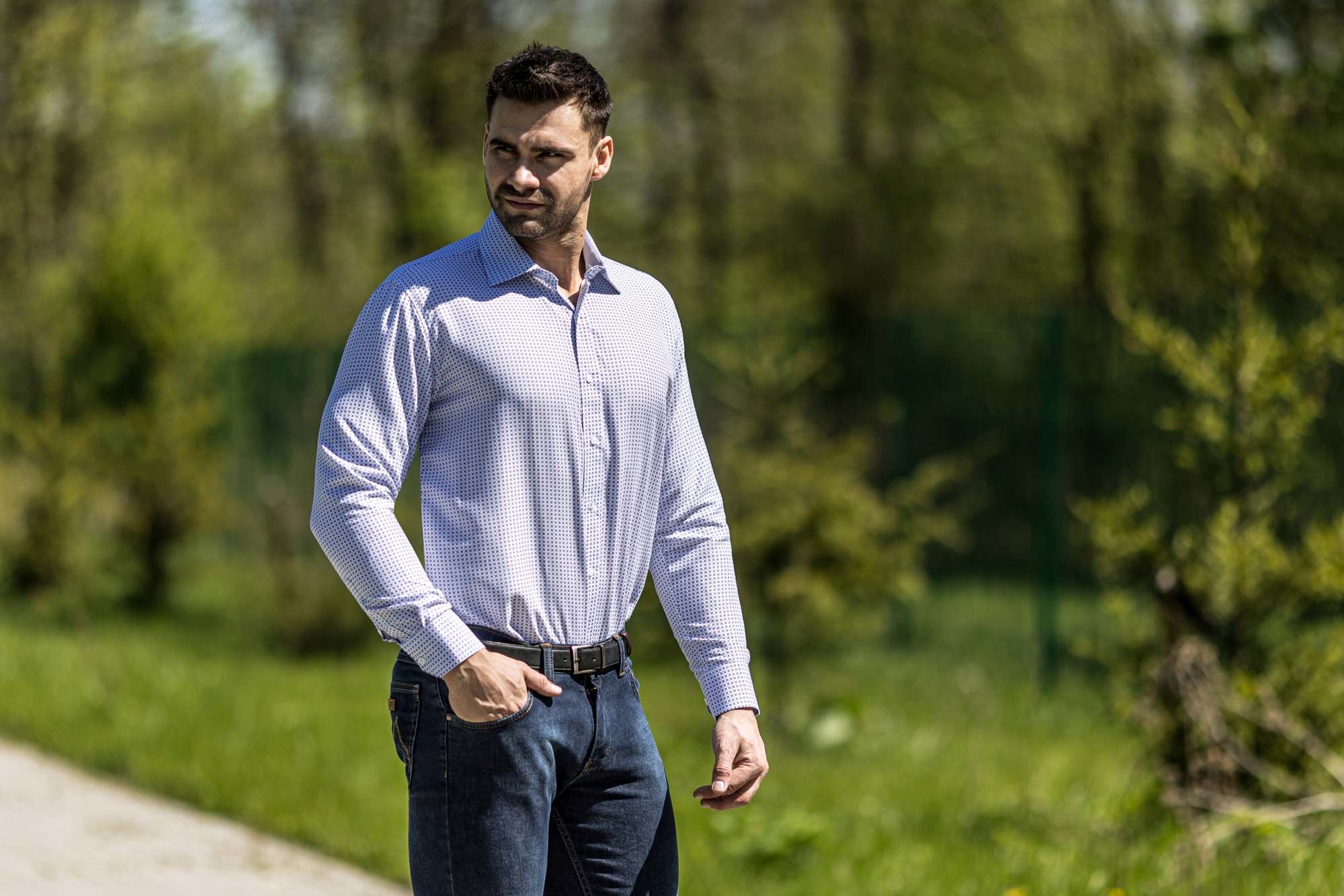 Мужская рубашка с длинными рукавами очень универсальна, и ее можно носить по-разному.