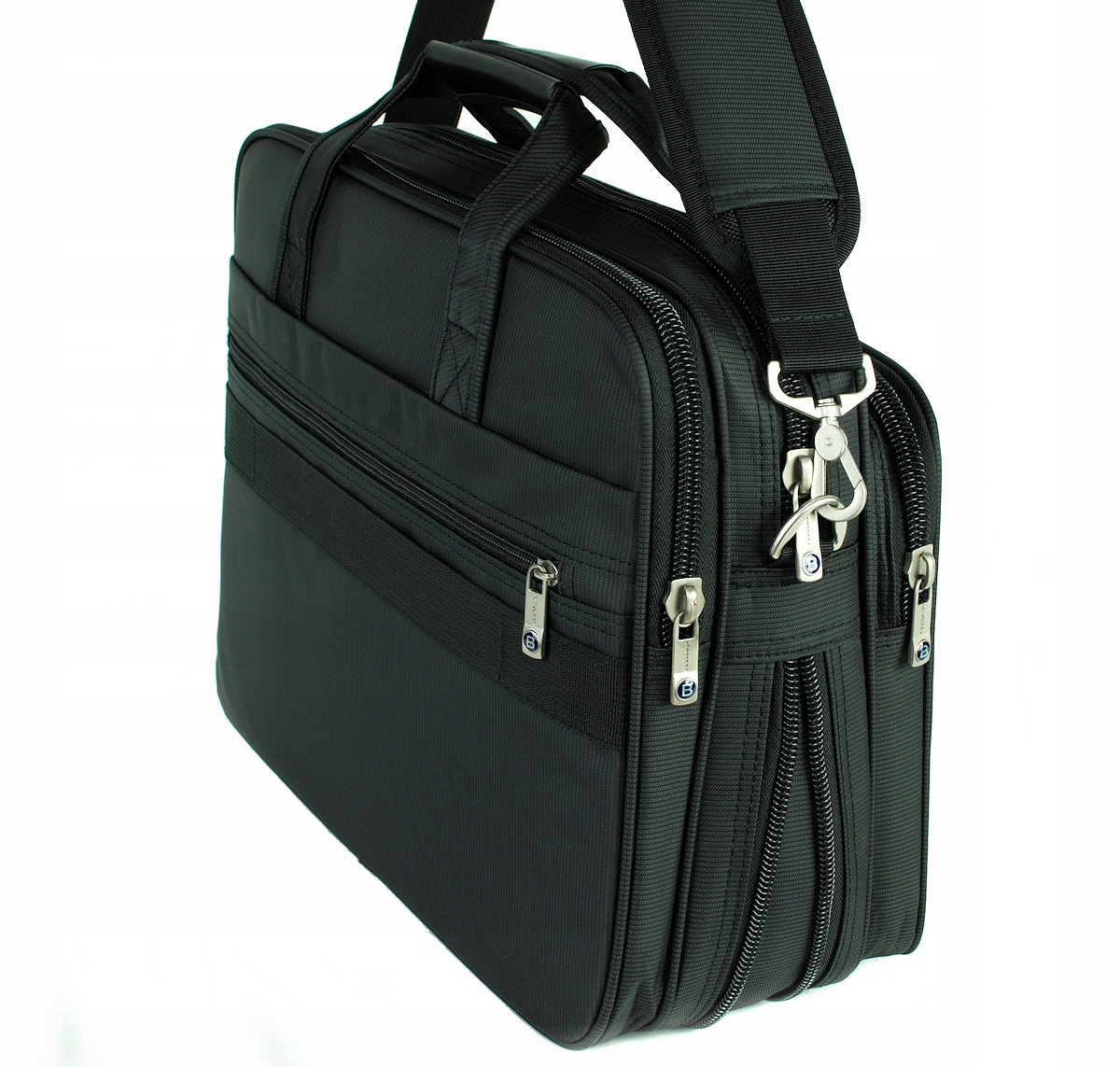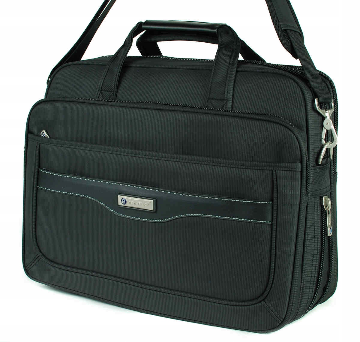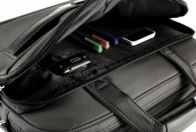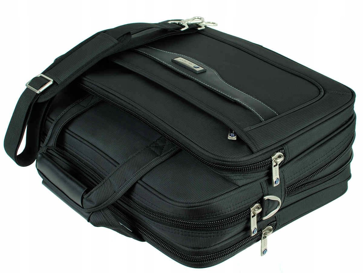 Сумка классического дизайна подойдет как к элегантному, так и к повседневному наряду. Идеально подходит для переноски документов, бытовой электроники и предметов повседневного обихода. Изготовлен из полиэфирной ткани, усиленной полиуретановым покрытием снизу. Внутри отделана подкладкой и усилена эластичной пеной. Имеет 10 различных карманов, в том числе 6 на молнии. Самое большое отделение имеет размеры 30 х 40 х 6-9 см и включает в себя перегородку на липучке 29 х 36 х 4 см. Сзади имеется карман размером 30 х 40 х 3 см для документов, газет и карман поменьше на молнии. Спереди есть место для ручек, телефона и т. д. Снаружи сзади потайной карман на молнии, рядом с ним крепление для дорожных чемоданов. Сумка имеет ручки для переноски в руке и регулируемый съемный ремень с наплечником максимальной длиной 135 см.