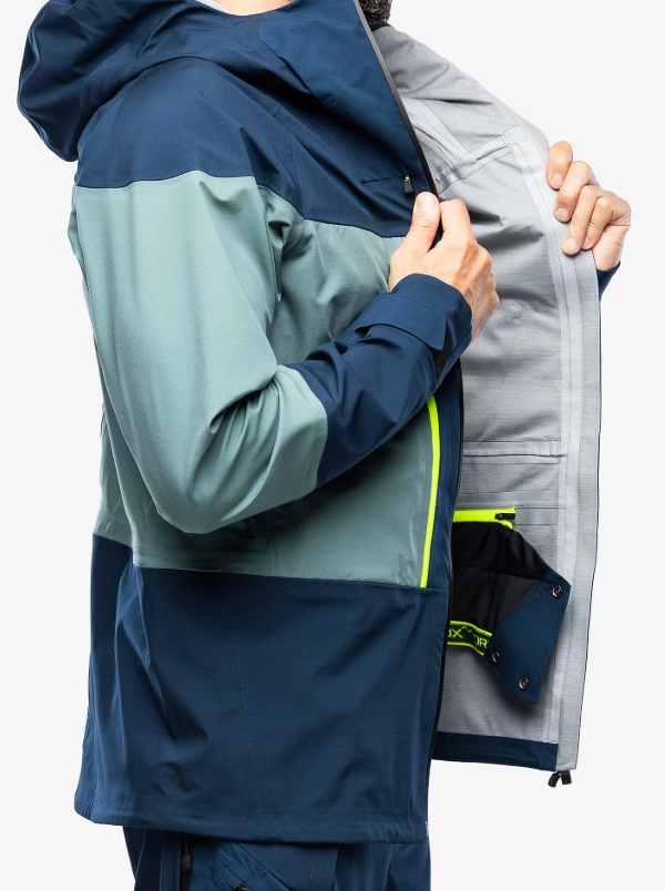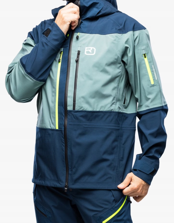 Куртка изготовлена из комбинации трех материалов – полиамида, полиуретана и мериносовой шерсти. Полиамид, используемый во внешнем слое, представляет собой материал, отличающийся высокой прочностью. Внутренняя часть выполнена из мериносовой шерсти. Шерсть обладает антибактериальными свойствами, поэтому замедляет образование неприятных запахов. Более того, этот материал очень хорошо дышит и снижает риск раздражения. Мериносовая шерсть также обладает терморегулирующими свойствами. Горнолыжная куртка имеет два передних кармана, а также карман для ски-пасса и внутренний карман из сетки из мериносовой шерсти для телефона.