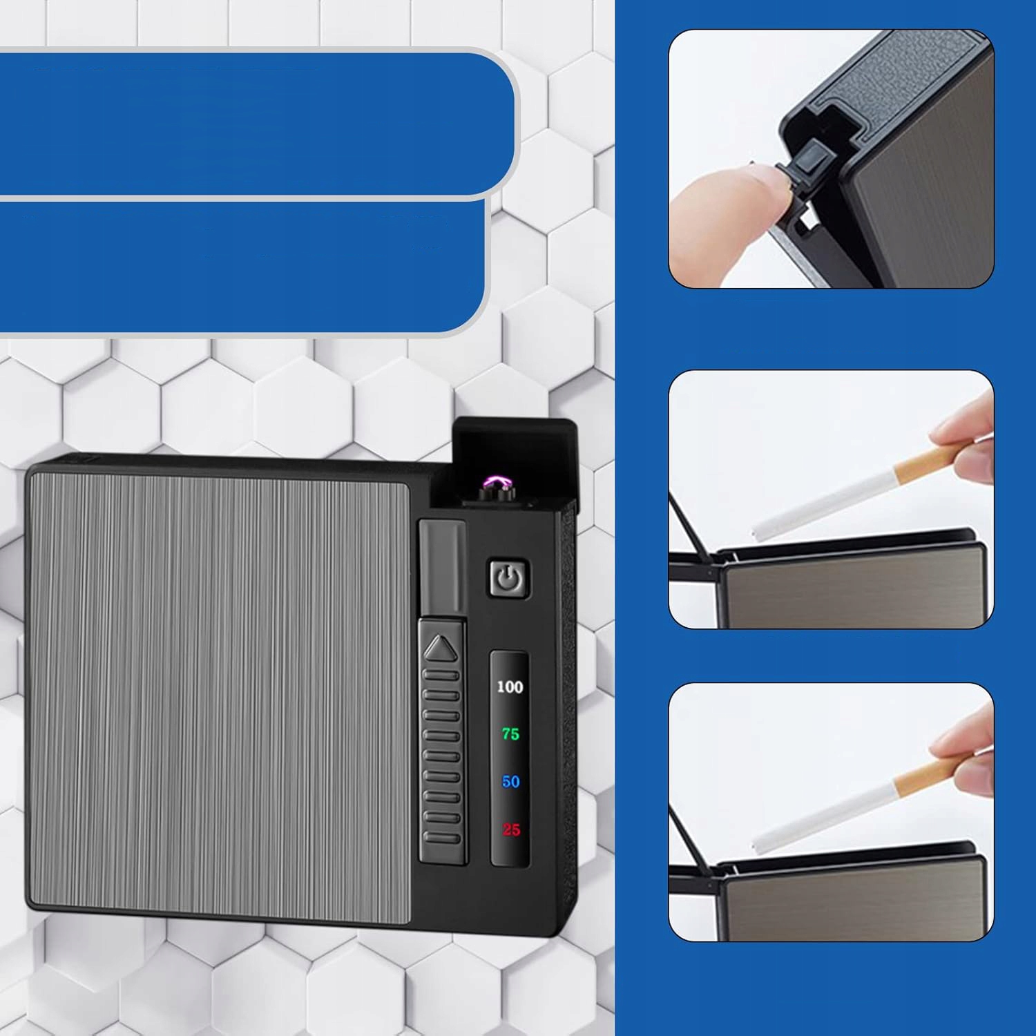 до 20 сигарет (в зависимости от размера сигарет). Коробка может быть легко открыта и закрыта с помощью шарнирной крышки.