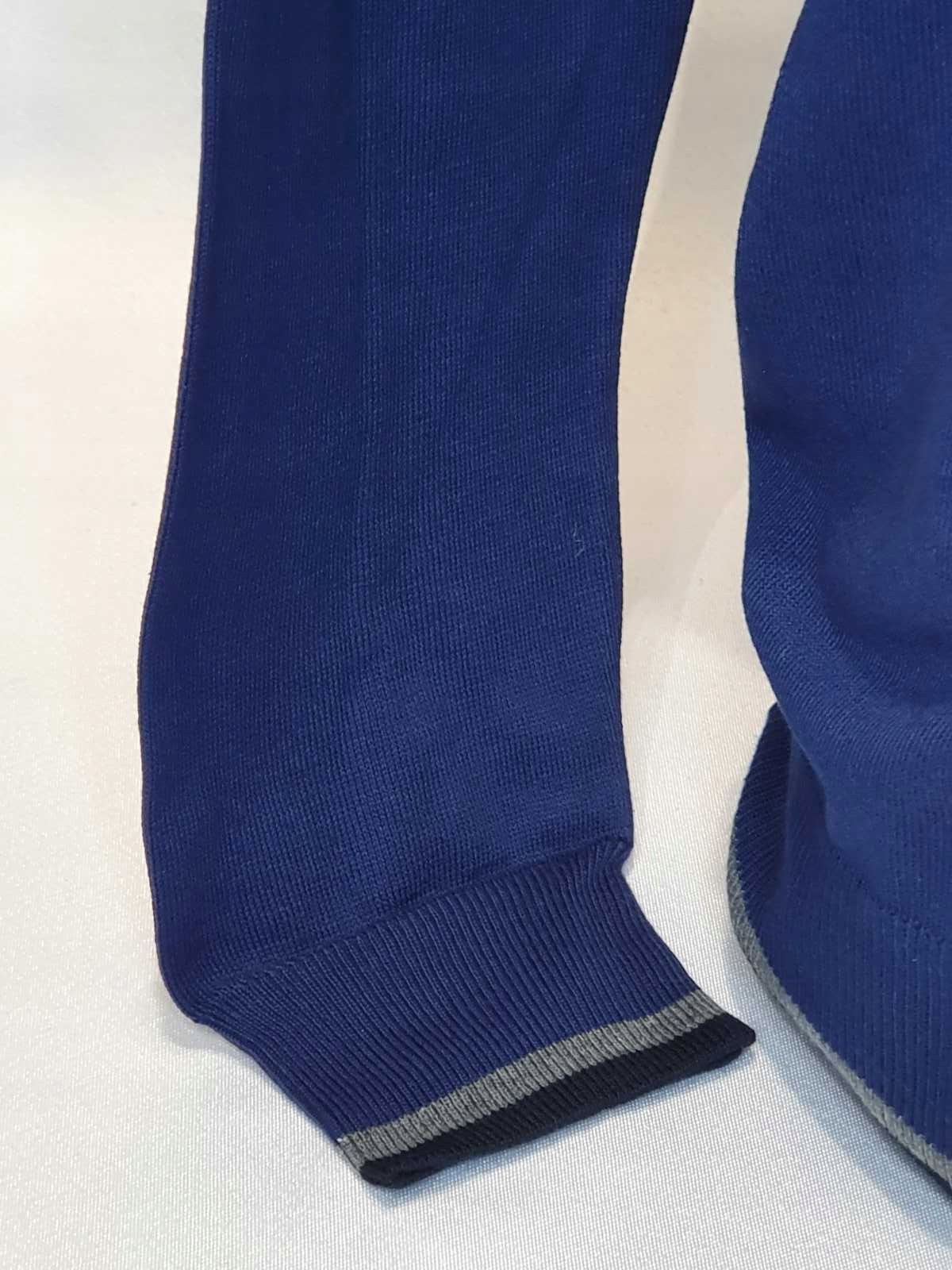 - Горловина свитера и манжеты отделаны черно-серыми манжетами.