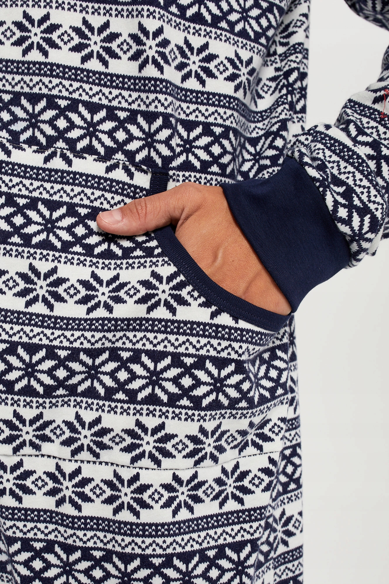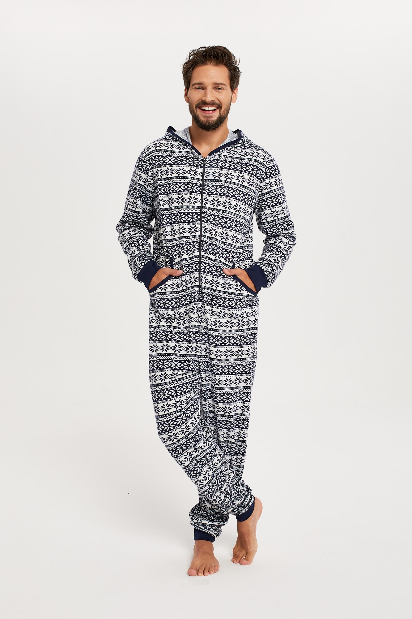 Мужской комбинезон Аляски -необычное предложение для мужчин, которые любят нестандартные стили. Вечный, норвежский рисунок в белых снежинках на флотном фоне является интересным вариантом для зимних вечеров. 100% ватный продукт гарантирует высочайшее качество и долговечность. Отделанный темно -синим выкрой на рукавах и ногах, он обеспечивает комфорт и комфорт. Костюм прикреплен на молнии, способствуя использованию. Он доступен в размерах от S до XL.