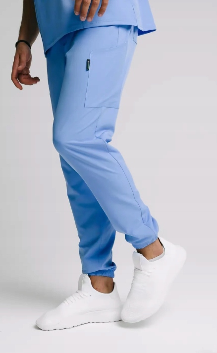 Брюки из легкого материала, эластичного в четырех направлениях. Ткань струящаяся и прохладная на ощупь, что идеально подходит для теплых дней. Имеют шесть карманов, резинку и шнурок на талии. Карманы имеют скошенную форму и достаточно велики, чтобы в них легко поместился стетоскоп или смартфон. Каждый карман крепится специальными болтами. Эластичный пояс очень эластичен. Декоративная тесьма с металлическими наконечниками, пришитая к задней части ремня, предотвращает выпадение тетивы. Внешний вид брюк дополняют детали в виде строчки на карманах и на нижних резинках.