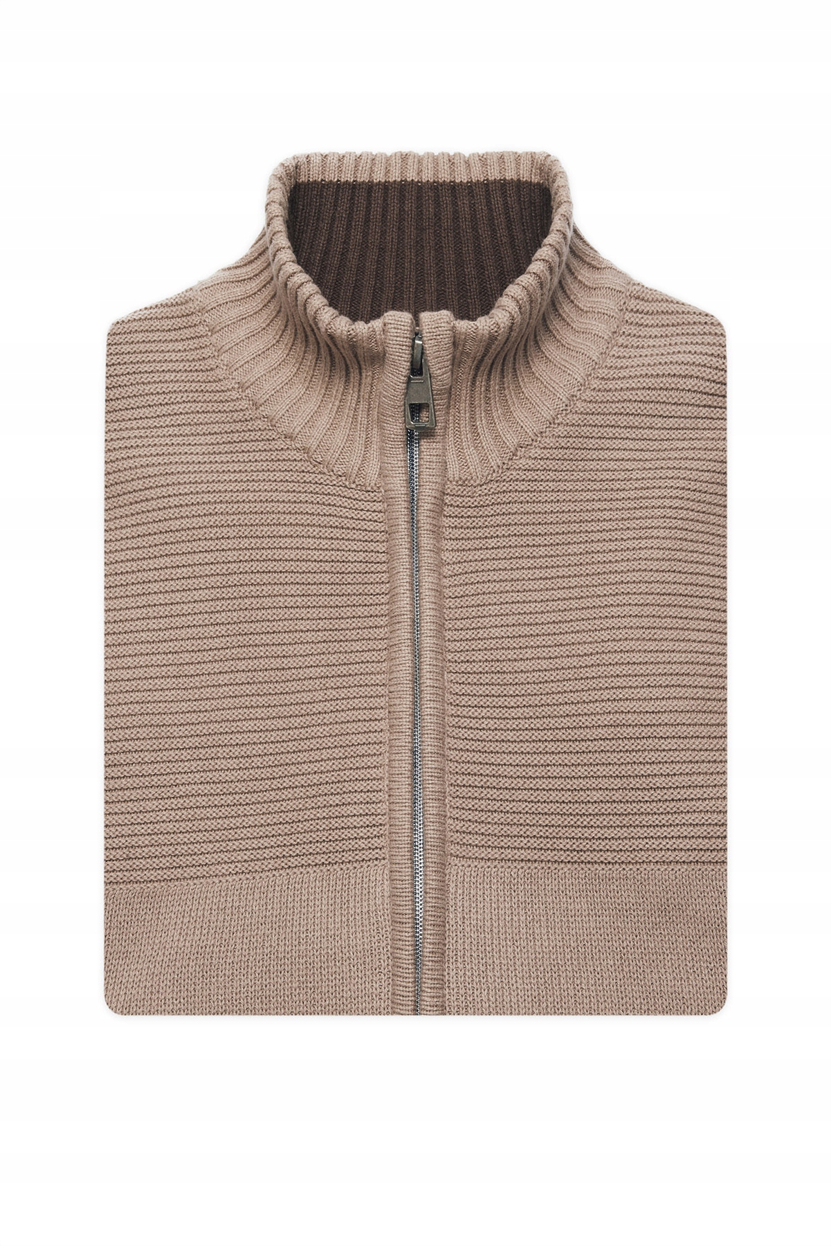 бежевый мужской порезанный свитер с удобным разрезом. Модель Craig имеет молнию, два закрытых кармана по бокам, воротник с высокой стойкой и характерное, ребристое плетение спереди. Воротник на стоянке на внутренней стороне украшен контрастным цветом.
