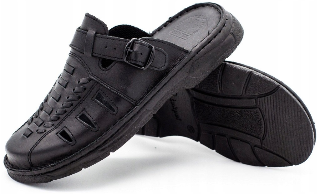 Польские мужские шлепанцы из натуральной кожи черного цвета. Украшен тонким перфорированным узором. Легкая и удобная модель с гибкой подошвой. Прошитый край.