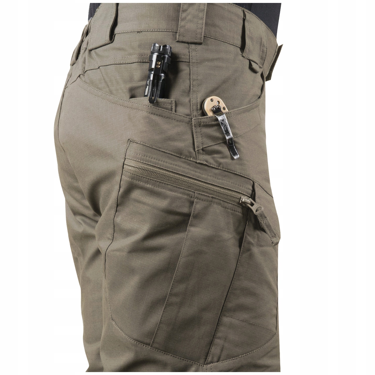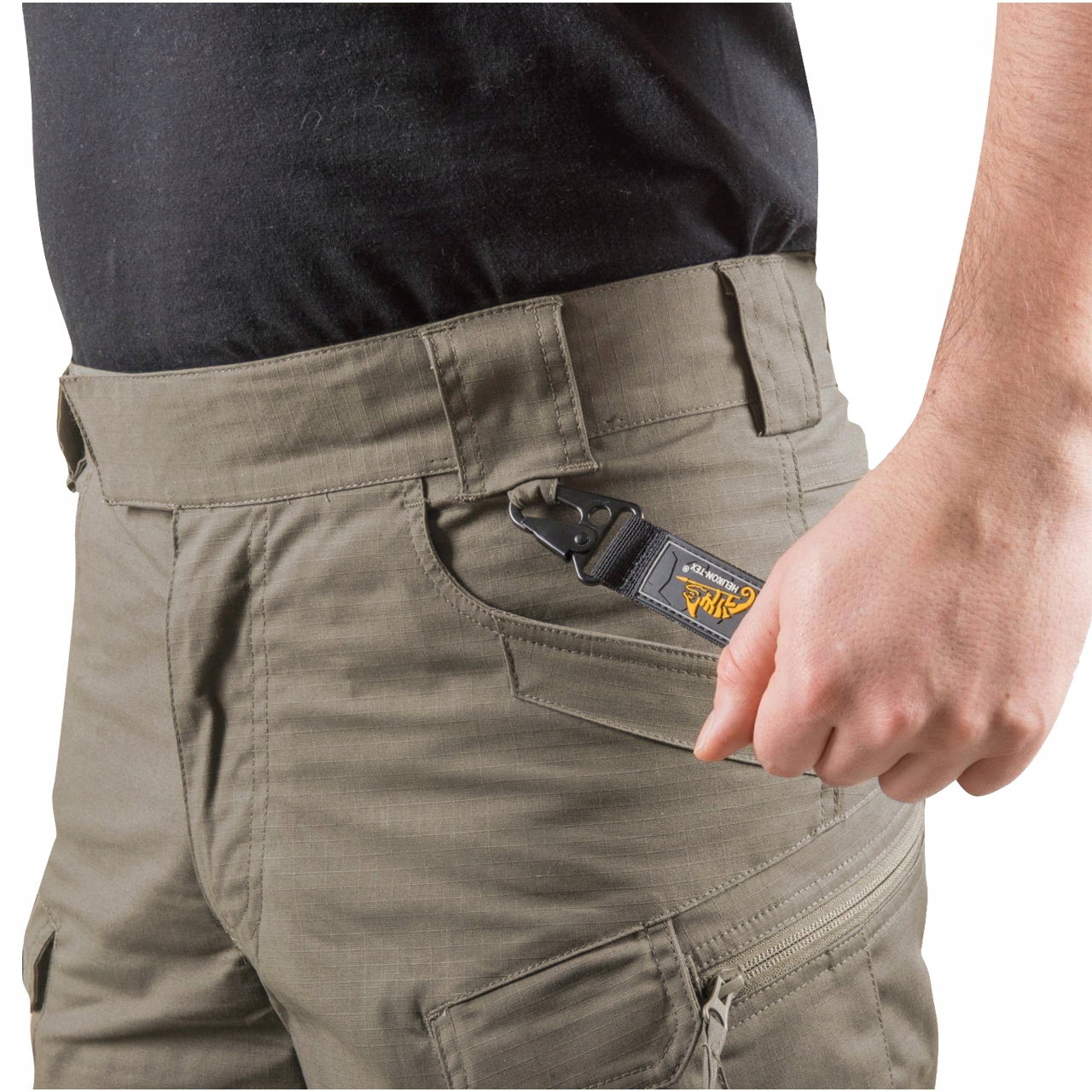 - Две петли для карабина или D-образного кольца на поясе спереди брюк.