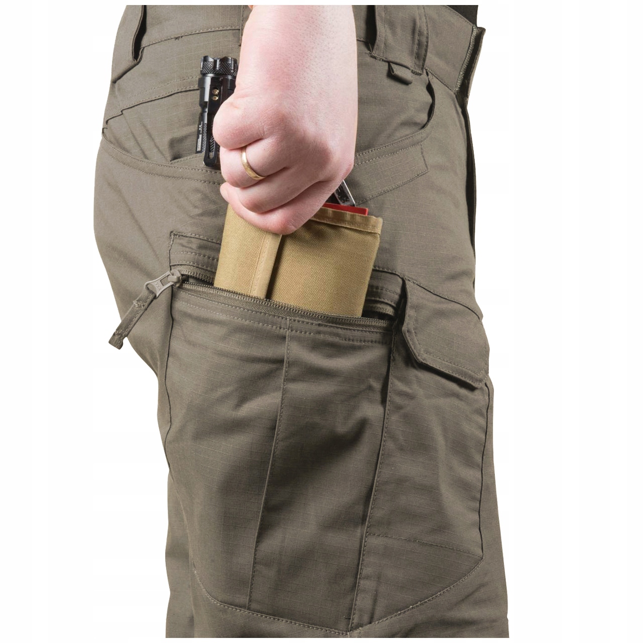 Правильно расположенные карманы позволяют разместить снаряжение ближе к центру тяжести — вокруг бедер и талии. Края переднего и заднего карманов дополнительно усилены, чтобы выдержать интенсивное вставление зажимов для ножей или фонарей. Два кармана на передней части бедер, застегивающиеся на липучки, идеально подходят для ношения смартфона, но они достаточно велики, чтобы вместить даже магазин AR/AK. Боковые набедренные карманы на молнии на первый взгляд плоские, но их конструкция позволяет без проблем носить с собой довольно крупные предметы, например кошелек или небольшую сумку.
