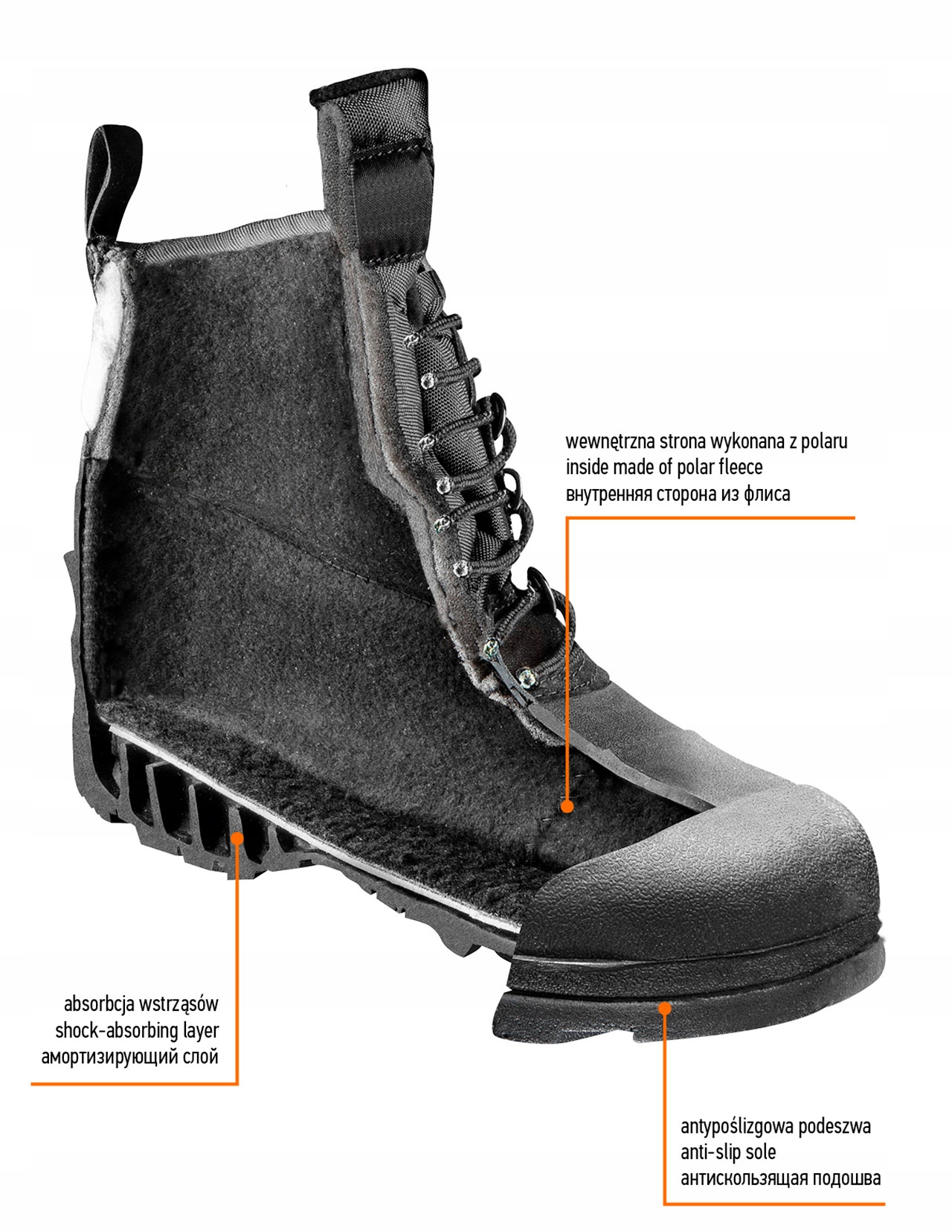 Мужские зимние ботинки NEO (82-132) размера 41 — базовое снаряжение для зимних работ на свежем воздухе. Экокожа, покрытая высококачественной резиной TPR, гарантирует защиту ног от снега и воды. Внутренняя изоляция обеспечивает высокий тепловой комфорт для пользователя, а противоскользящая подошва повышает безопасность пользователя при движении по скользким поверхностям. Бренд NEO оправдывает ожидания профессионалов.