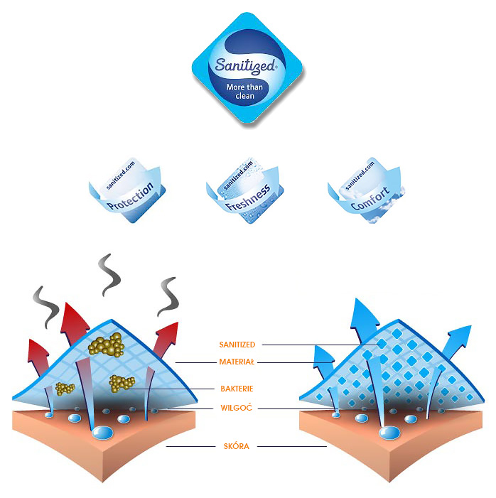 Sanitized® — это очень эффективные антибактериальные волокна, обладающие длительным действием и обладающие высокой устойчивостью к стирке. Основная причина использования такой отделки — предотвратить появление неприятного запаха и создать надежную и длительную защиту от бактерий, запаха и плесени. Изделия, обработанные таким образом, дарят ощущение свежести даже в самых сложных ситуациях.