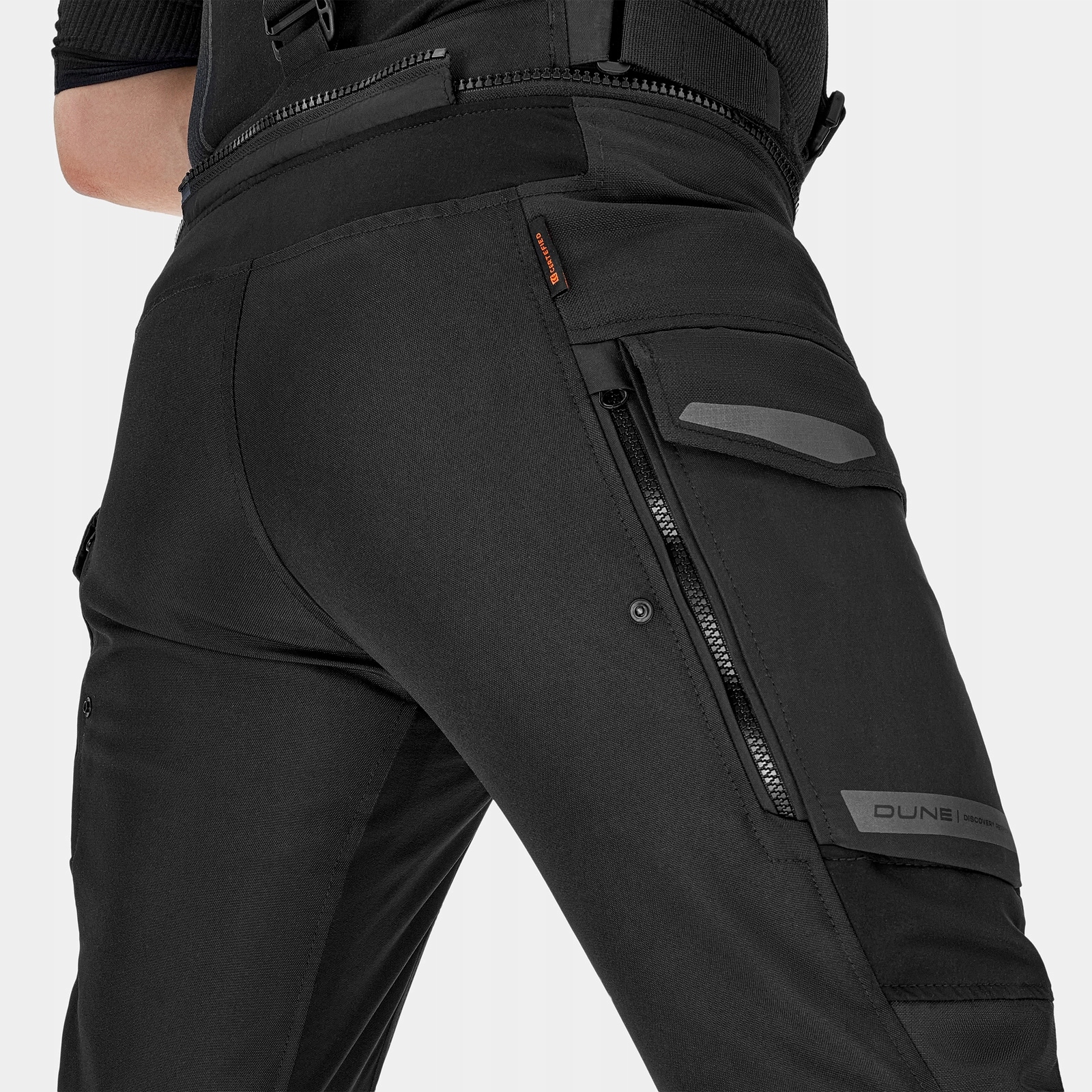 Практические решения, такие как водонепроницаемые грузовые карманы на бедрах, повышают функциональность, а система ночного видения с отражателями обеспечивает пассивную безопасность в ночное время. Для еще большего комфорта во время длительных маршрутов брюки можно оснастить дополнительными подтяжками.