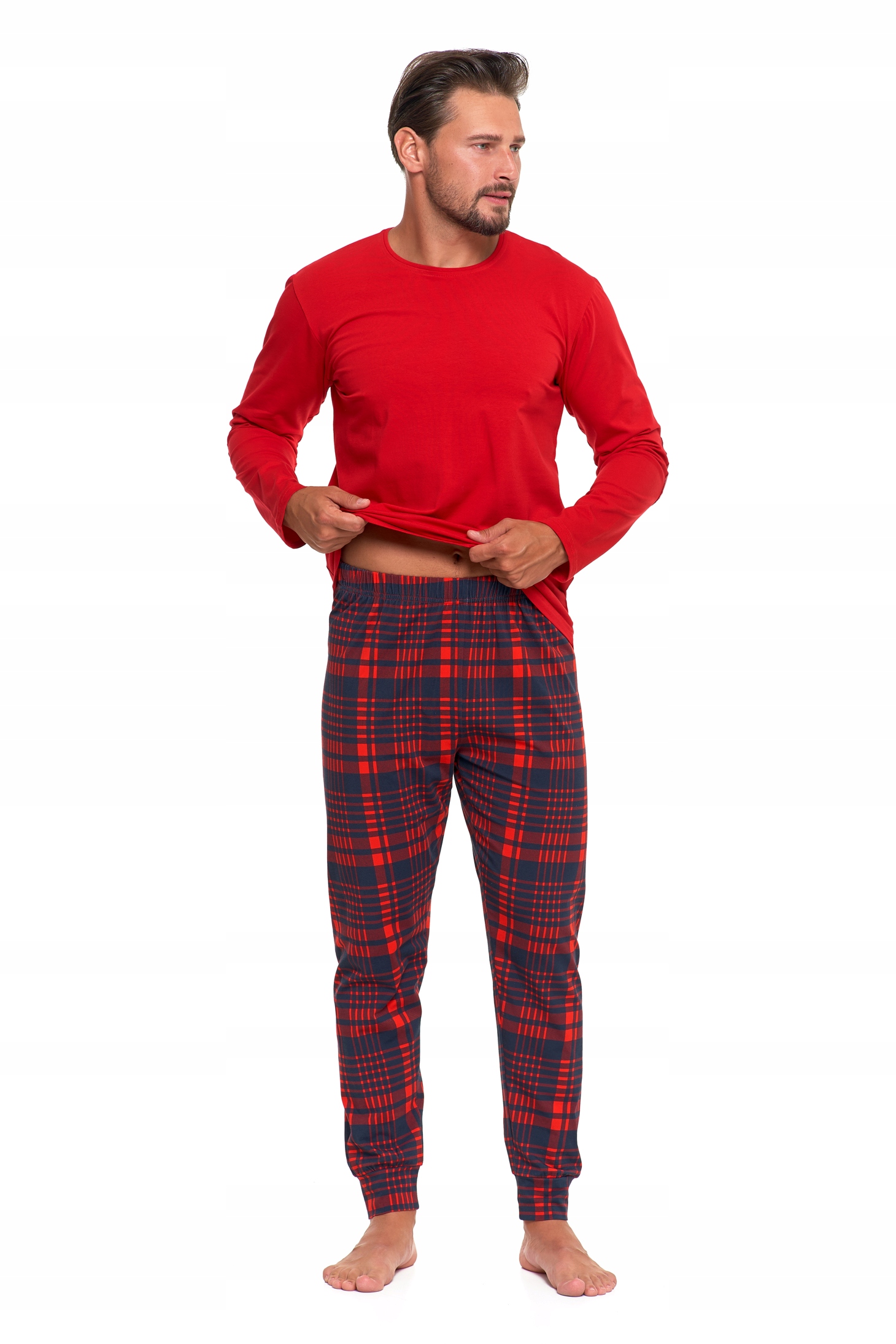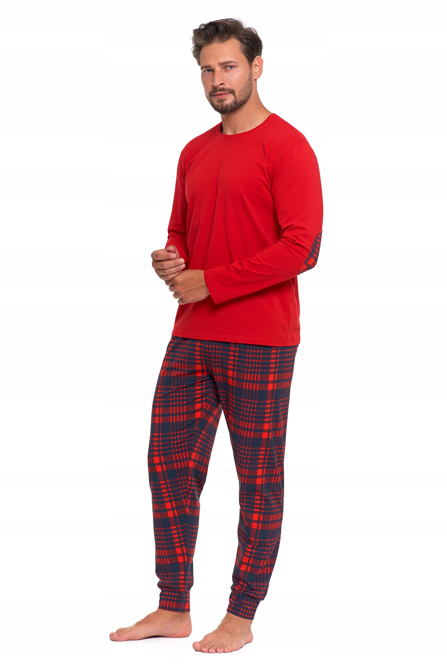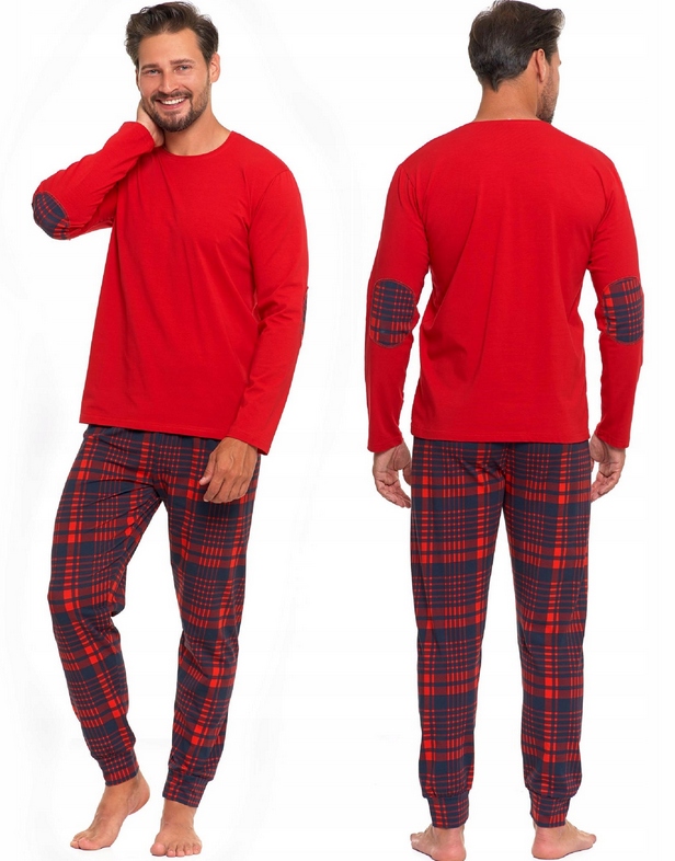 Верх пижамы представляет собой красную футболку с длинными рукавами, украшенную модными нашивками в клетку на локтях. Классические красные брюки в клетку с темно-синими вставками прекрасно дополнят весь комплект. Идеальный набор в подарок особенному мужчине :)