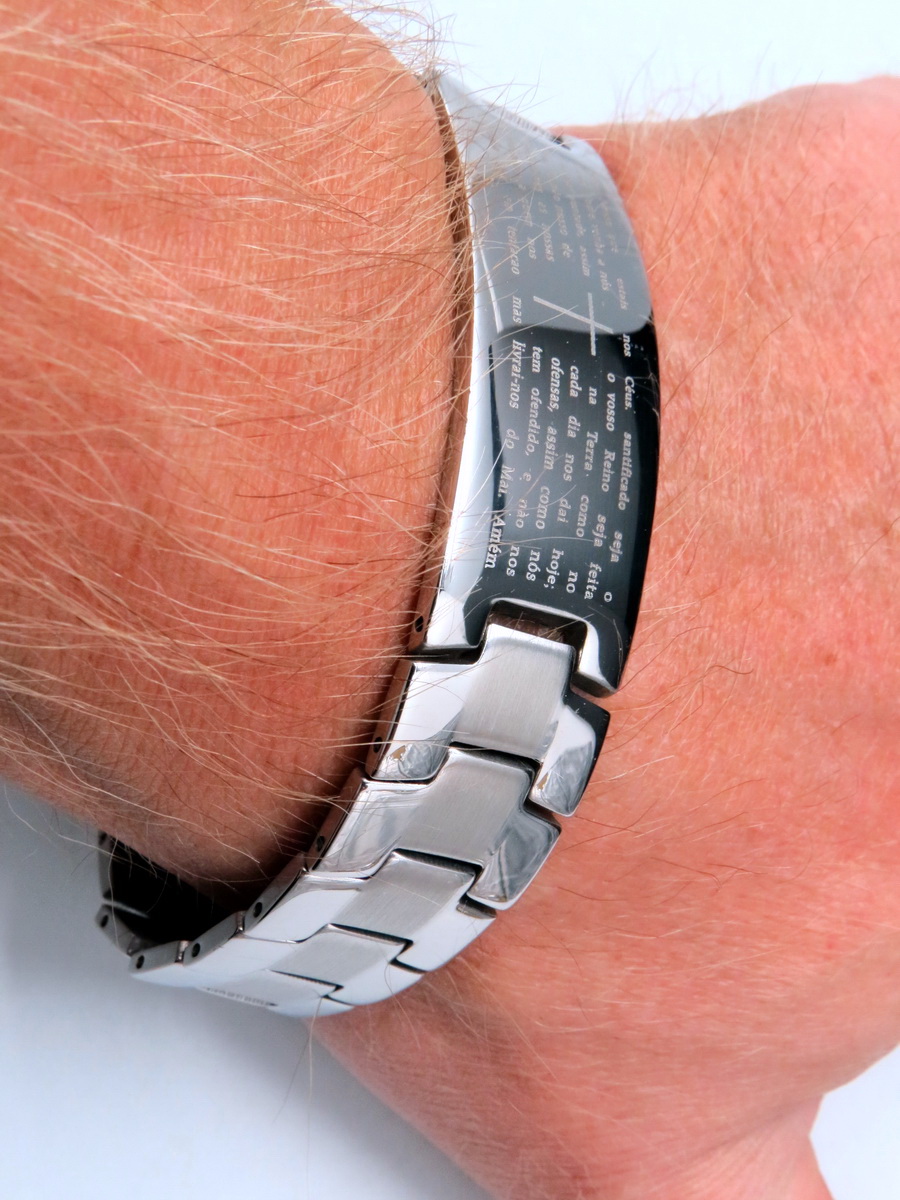 В этом предложении мы представляем исключительно элегантную модель мужского браслета, который изготовлен из ВЫСОКОКАЧЕСТВЕННОЙ ХИРУРГИЧЕСКОЙ СТАЛИ 316L< /б>. Отдельные элементы браслета имеют очень интересный дизайн (матовый центр и глянцевые бока). На браслете имеется точная и неразрушимая гравировка молитвы «Отче наш» на португальском языке — древнейшей и самой важной молитвы христиан. Этот массивный узор шириной 18 мм производит невероятное впечатление, а на руке все это смотрится эффектно!!!