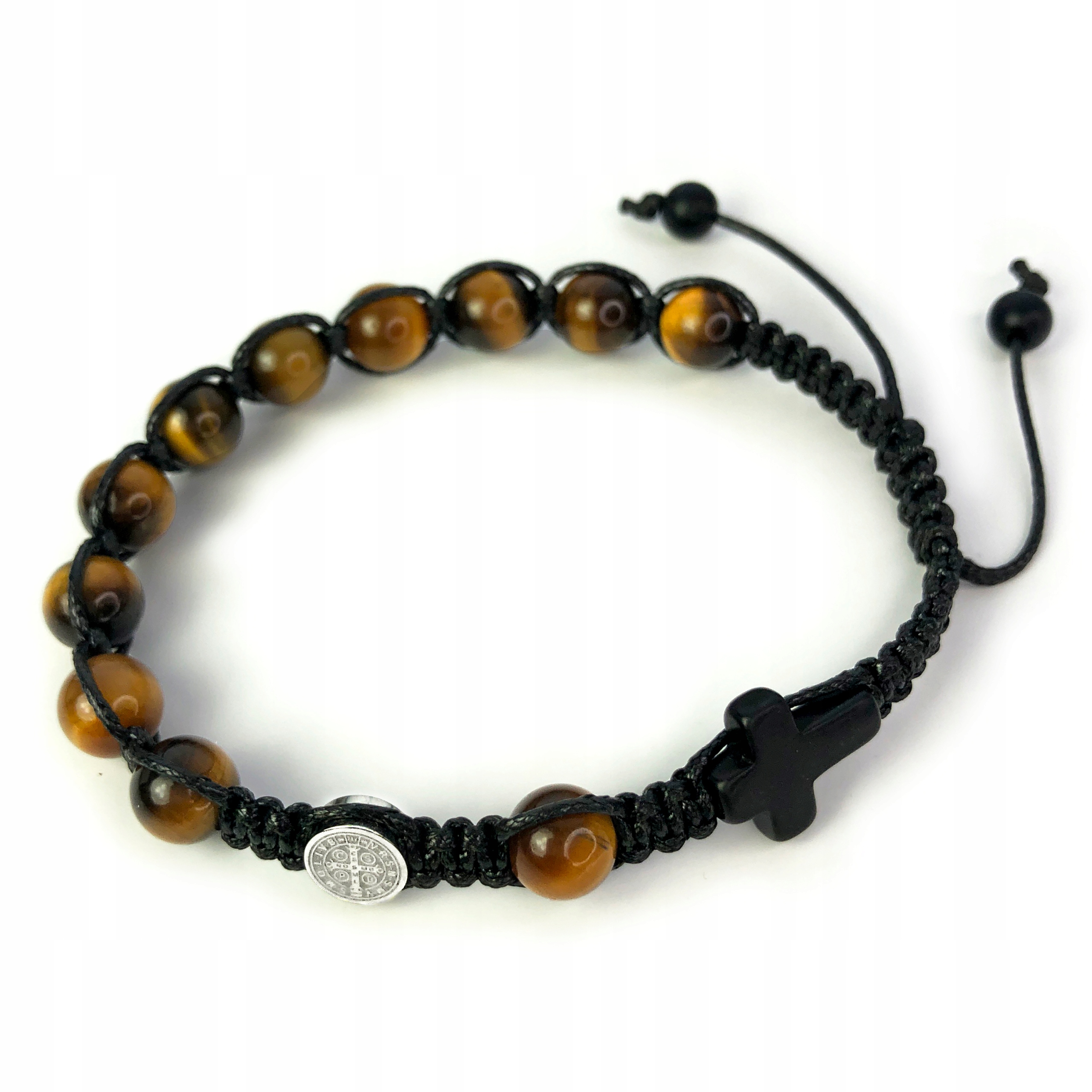 Браслет, изготовленный из натуральных декоративных камней - Тигровый глаз и черный матовой ониккс с медальоном святой. Бенедикт нержавеющей стали (хирургический).