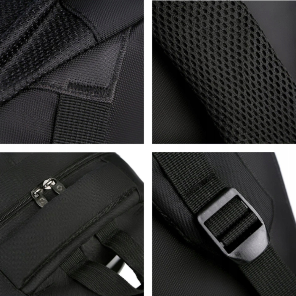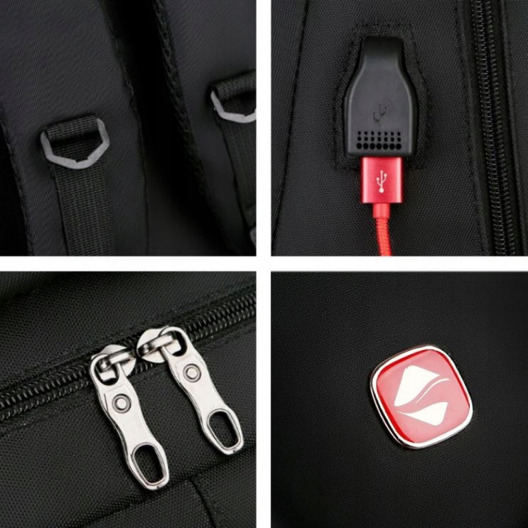- Количество карманов: 3 основных отделения на молнии, в основном отделении имеется 1 отделение для ноутбука, стандартный вход и USB-кабель, передняя стенка рюкзака жёсткая и усиленная, имеет 2 боковых кармана для бутылки или бутылки с водой, на задней стенке рюкзака имеется небольшой Противокражный карман на молнии.