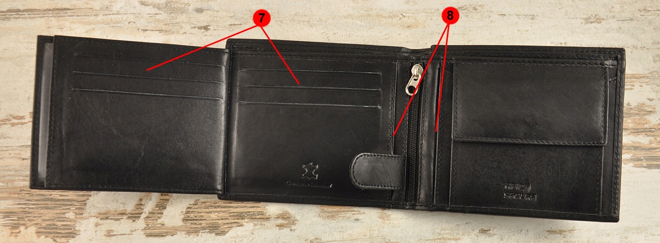 8 - два отделения для свидетельства о регистрации автомобиля в обложке, визиток и т.п.