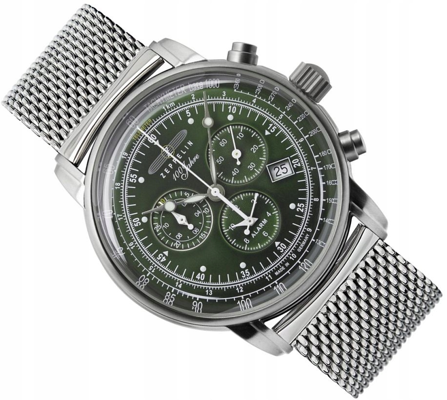 Мужские часы Zeppelin 8680M-4 Винтажная зеленая хроновая стальная будильника сетка