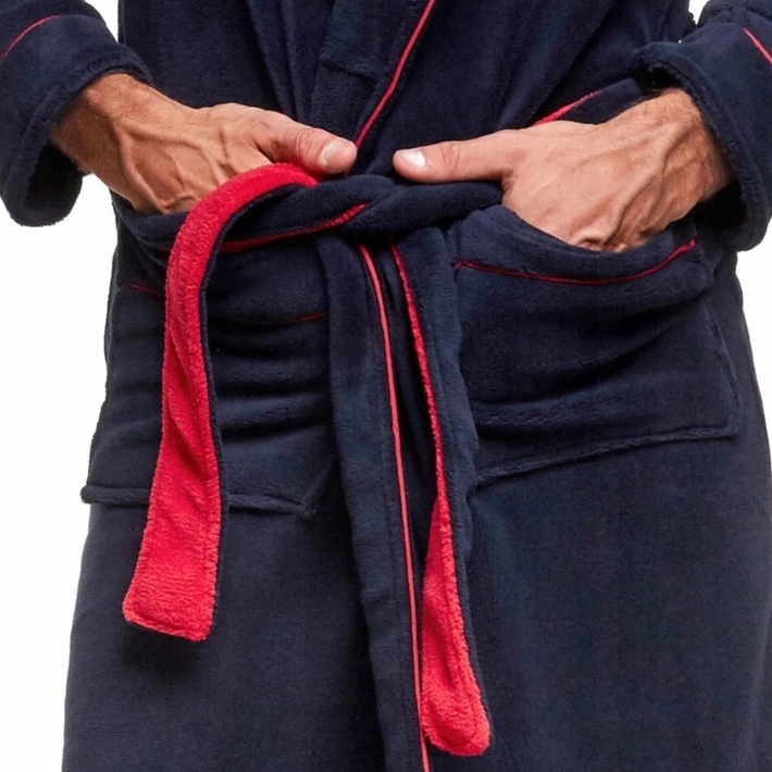 Темно-синий халат – это квинтэссенция элегантности и комфорта в домашней мужской одежде, идеальный для тех, кто ценит классические решения в современном исполнении.