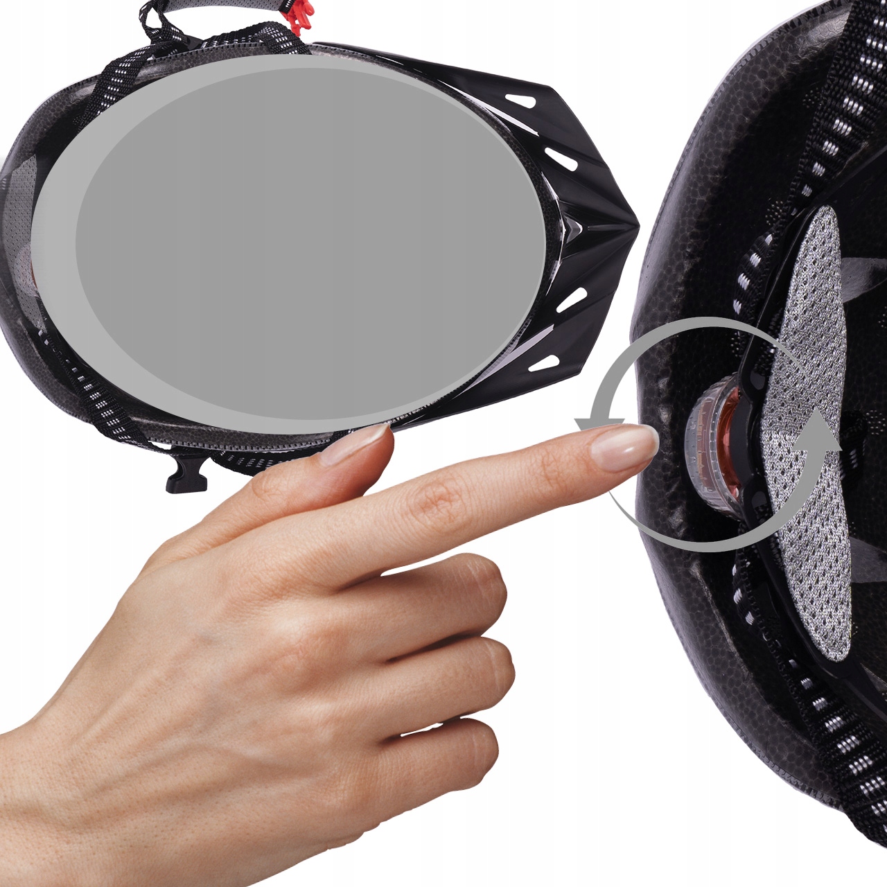 Простая и быстрая регулировка размера возможна с помощью системы FIT SIZE, т.е. многоступенчатое кольцо для плавного регулирования контура. Одной рукой вы можете за несколько секунд отрегулировать его по размеру головы с помощью небольшой ручки на задней части шлема.
