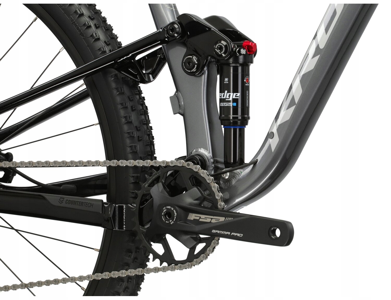 Система Trunion — это современный способ крепления заднего амортизатора к раме, укорачивающий ее. Однако в то же время он сохраняет то же значение прыжка. Передний амортизатор представлял собой воздушный SR Suntour XCR 32 RLR AIR с ходом 100 миллиметров и пневморессорой. Это делает его более жесткой и легкой конструкцией по сравнению с прошлогодней моделью. Его дополняет задний амортизатор того же производителя — SR Suntour Edge R. На руле имеется стопорный рычаг, который придает жесткость обоим амортизаторам, помогая эффективно крутить педали на ровных участках трассы. Чтобы обеспечить хорошее сцепление даже в самых грязных условиях, мы оснастили его Schwalbe Rapid Rob шириной 2,25 дюйма, проверенным на многих маршрутах. Рама изготовлена из сверхлегкого алюминия.