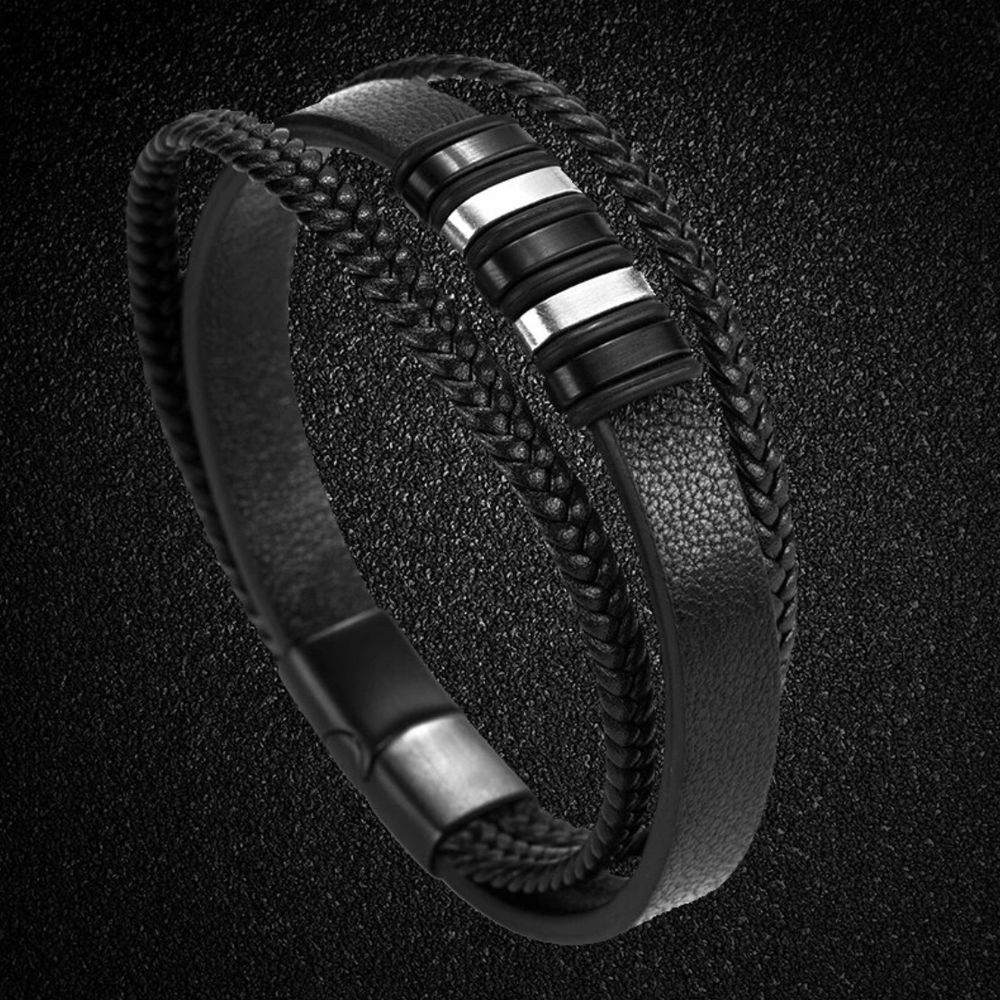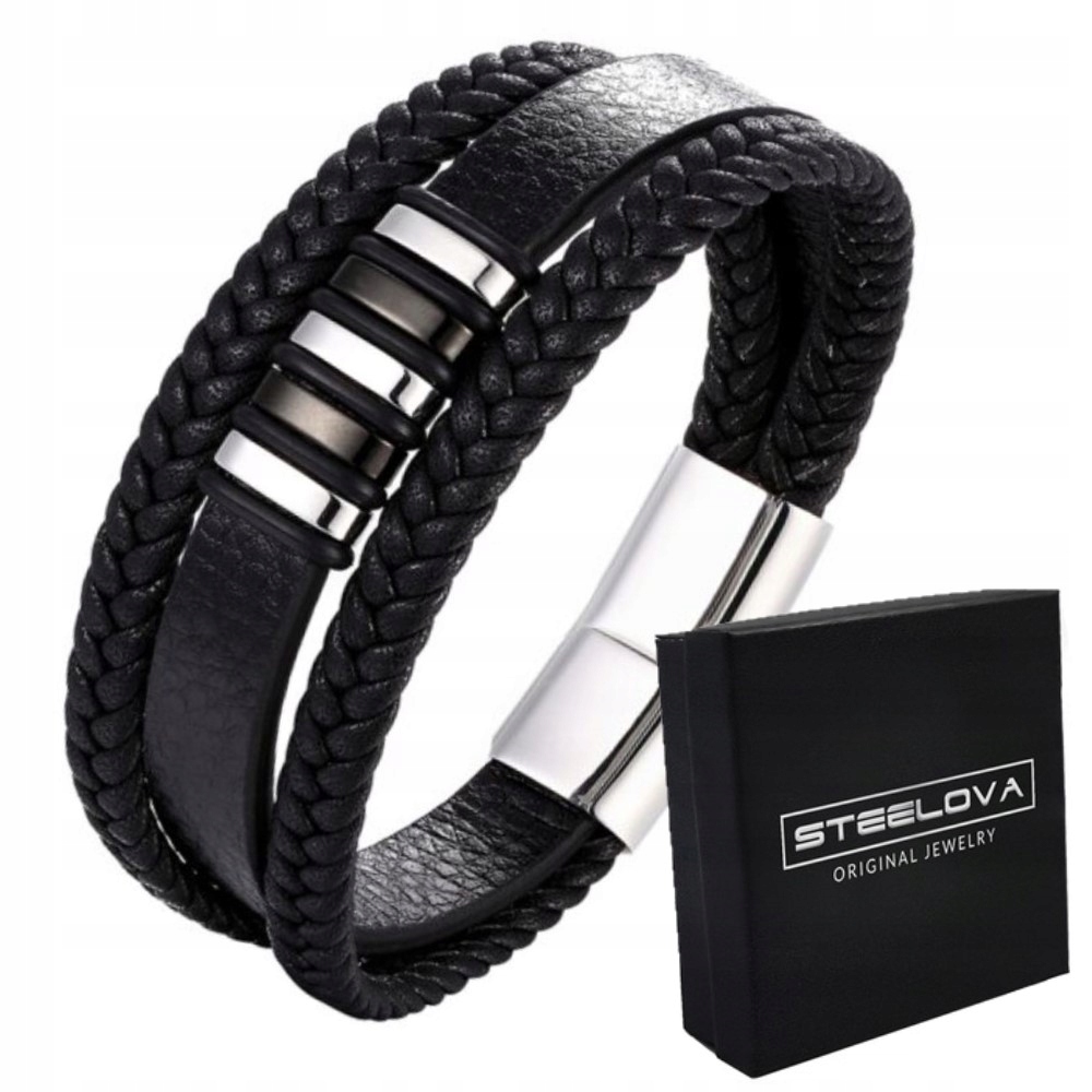 Элегантный, стильный браслет из высококачественной кожи черного цвета. Браслет имеет удобную и комфортнуюмагнитную застежку, изготовленную из хирургической стали 316L, также известной как ювелирная сталь, нержавеющая сталь или благородная сталь. Черный цвет металлических элементов обусловлен долговечным методом Ion Plating анодирования, который позволяет наслаждаться покрытием, не беспокоясь о его стирании. Изделие состоит из переплетенных кожаных ремешков, которые идеально сочетаются с деталями из полированной стали, помещенными на гладкий ремешок. Браслет имеет 5 небольших узких пластин, разделенных резинками, которые вместе с застежкой можно персонализировать, сделав индивидуальную гравировку в виде, например, имен или инициалов близких, детей, важных дат или символов. б>. Тогда, помимо своей декоративной и эстетической функции, изделие станет более ценным и будет служить сувениром долгие годы. Все сделано с большой точностью и вниманием к деталям, с использованием материалов высочайшего качества. Уникальный дизайн делает его идеальным в качестве подарка.
